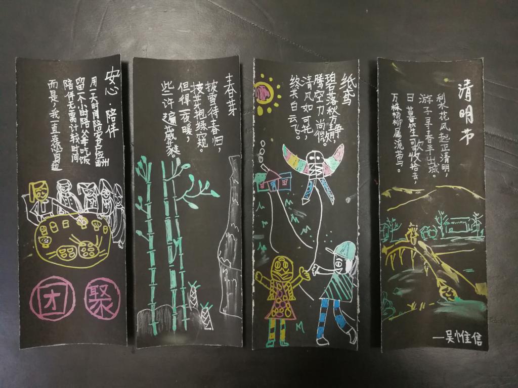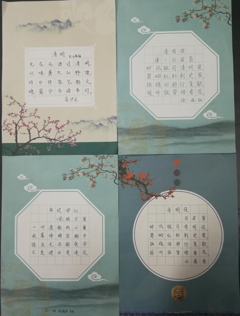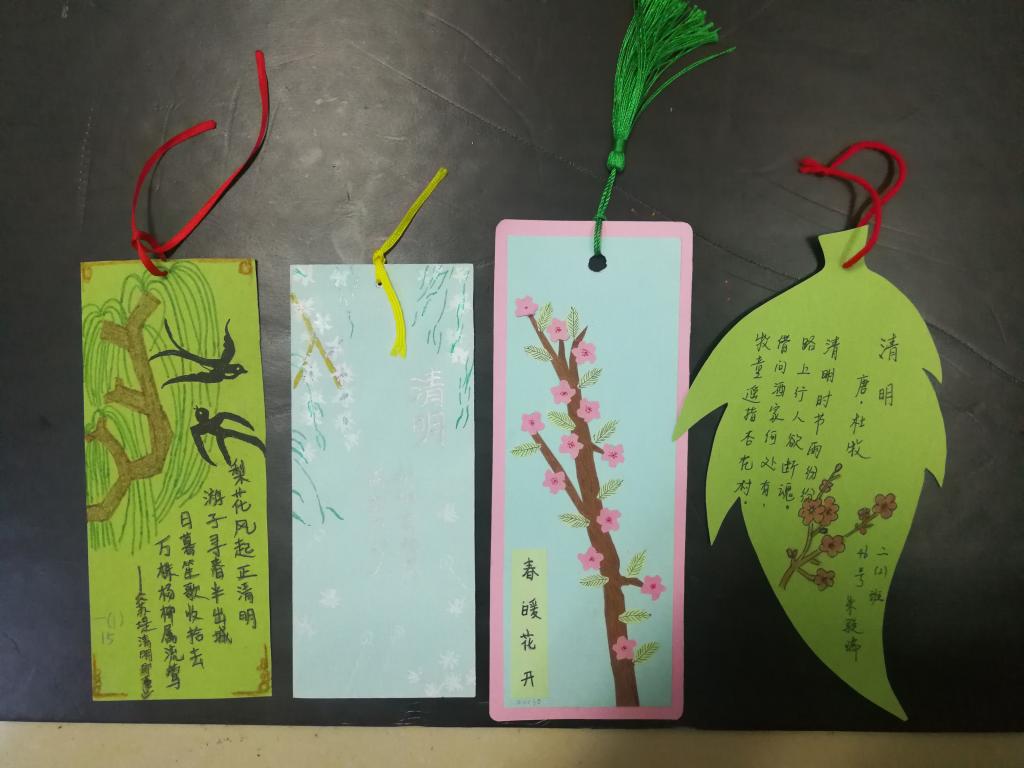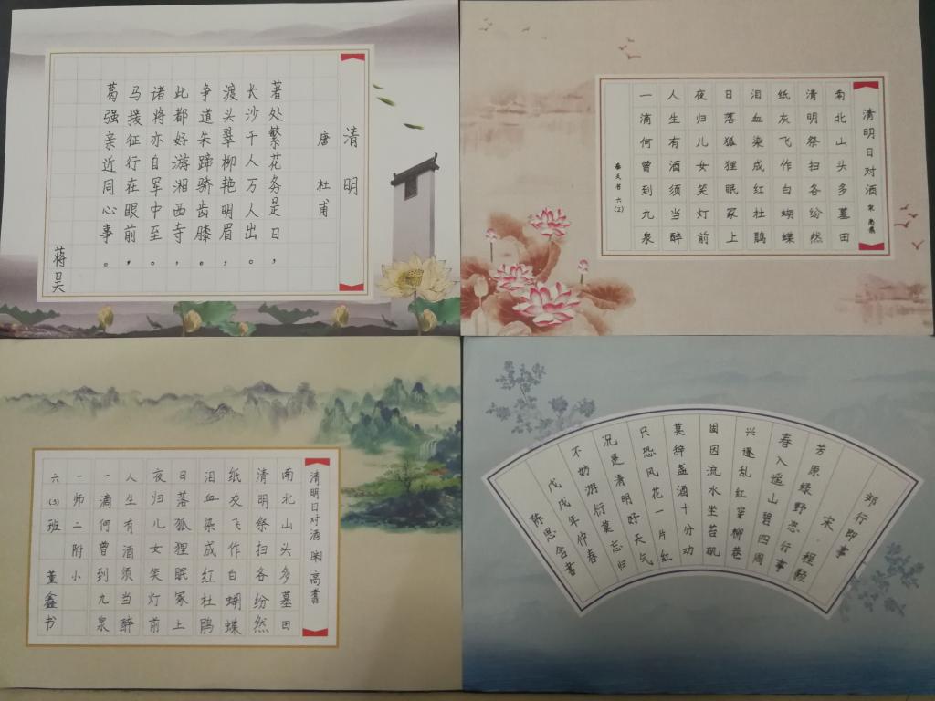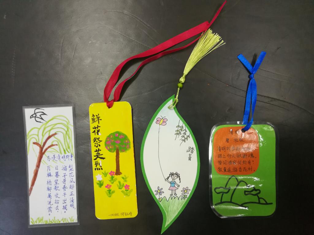 我校大队部还精心策划了两个特色活动:低年级手绘书签活动和高年级笔墨传情活动。瞧,一张张书签形态各异、精致美观。一幅幅书法作品洋洋洒洒、刚劲有力。这样的活动,将纪念传统节日、弘扬民族精神变成了学校文化建设的一道靓丽风景。也让队员们感受到了一个别样的清明节。