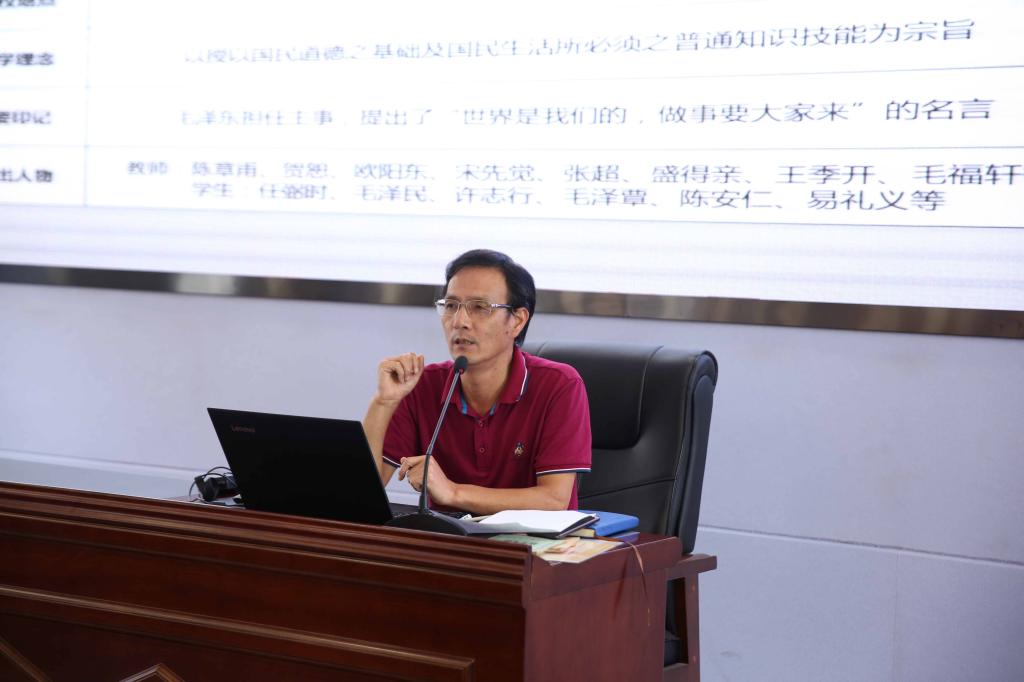 颁奖典礼后,章校长紧扣学校新学期工作会议的精神,做了题为《知荣而后勇》的主题讲座。此次讲座分为两个部分,第一部分为“知荣篇”。章校长选取具有意义的时间节点,介绍了学校光辉灿烂的发展史,前仆后继的奋斗史,爱满胸怀的教育史。事业的伟大不仅在于目标的壮丽,更在于过程的壮丽;教育的美好不仅在于享有的丰富,更在于经历的丰富。百年附小的光辉历史成就了大批仁人志士,培养了无数优秀学子,也形成了富有特色的办学思想。在章校长深情的讲述中,我们得知毛泽东、任弼时、何叔衡等大批革命家都曾在这里工作学习的诸多故事,我们了解了前辈周奎生校长为学校发展奉献一生的感人事迹,这样的荣耀让在座的老师都为身为附小人而骄傲。
