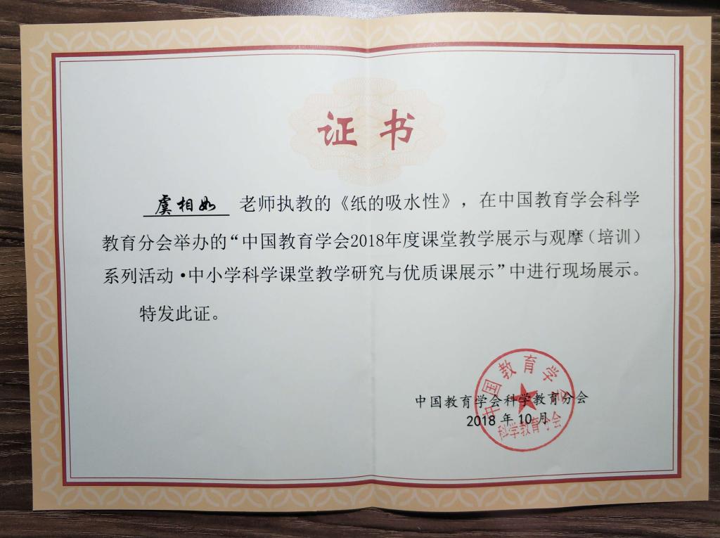 11月7日—9日,“中国教育学会2018年度课堂教学展示与观摩系列活动·中小学科学课堂教学研究与优质课展示”在广州市天河外国语学校隆重举行,来自全国的1400多名专家和科学教师参加了此次活动。优质课展示活动规格高,规模空前!由中国教育学会科学教育分会主办,广州市天河区教育局承办,全国34个省(市、自治区和新疆生产建设兵团)各派出一名教师代表展示教学课。8日上午,我校虞相如老师执教《纸的吸水性》,代表湖南省科学教师在活动中进行展示,获得与会专家和听课老师的高度好评!