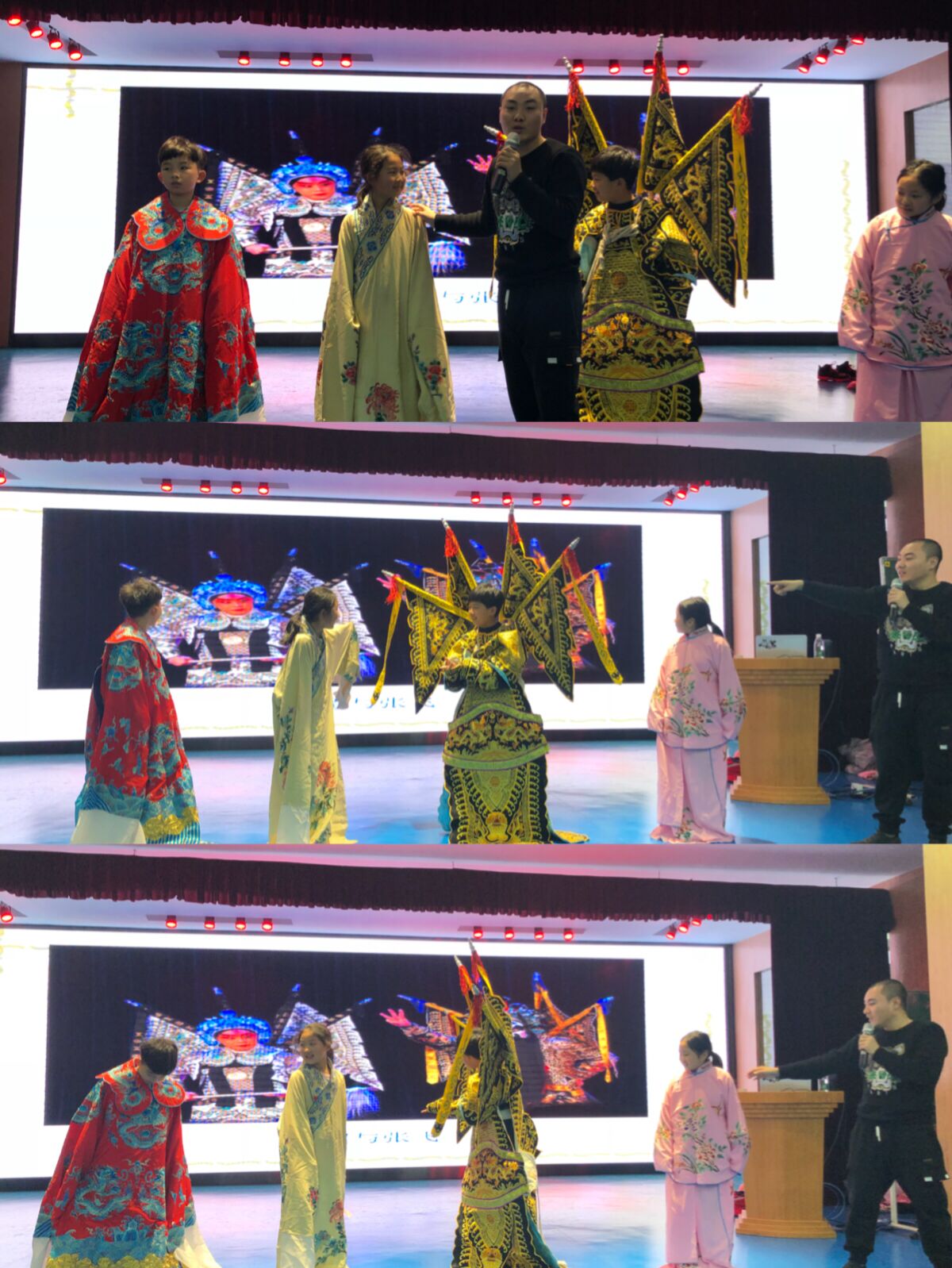 陈老师在讲到戏曲行当的特征的时候,他邀请了孩子们上台穿戏服,给小戏迷画脸谱,然后请台下的孩子们来根据服饰和脸谱来分辨角色。孩子们很快就知道了谁是老生,谁是青衣,谁是花脸。台上的同学们穿着戏服神气活现地跟着陈老师学着一招一式,画了脸谱的小戏迷激动地抱着陈老师合影留恋,台下的同学兴奋得欢呼雀跃的同时又羡慕不已。