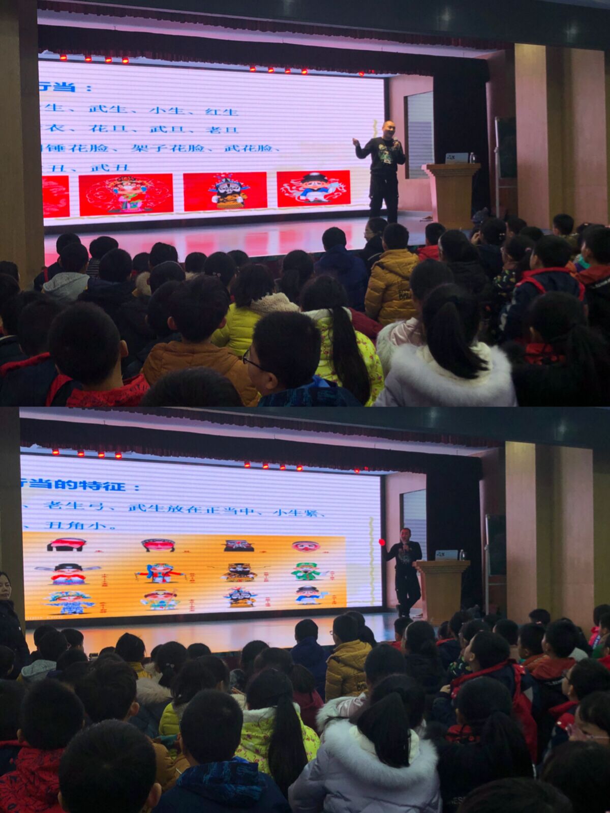 陈奇老师的课生动精彩。他讲到京剧的综合性、程式性及虚拟性的时候,不仅相机播放京剧的视频给孩子们边欣赏边讲解,还自己边表演边解说,孩子们听得兴趣盎然,热烈的掌声和笑声交织成一道动人的乐曲在大礼堂里回荡。