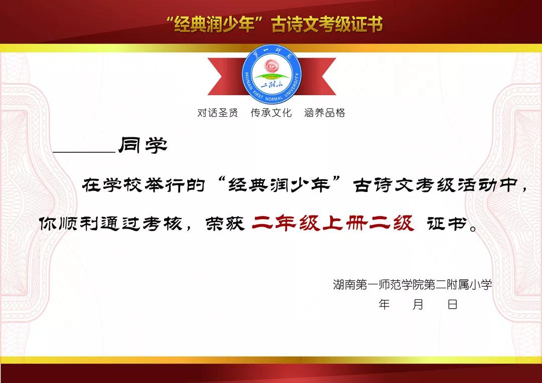 为了更好地检验孩子们的积累,近10年来,学校一直坚持“班级整体过关,学校随机抽查背诵”的机制,进行团体积分评奖。今年,学校对检查手段进一步规范优化,制定古诗文考级篇目,每个学期对每个年级的学习背诵内容进行考核。孩子们可以根据自己的实际情况,申请考一级或者二级,如果这次只获得一级证书,以后还可以继续通过努力再考二级。