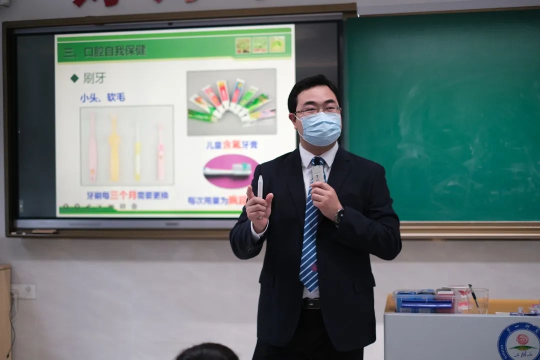 “小小石头白又硬,早晚要把澡来洗……”有趣的儿歌猜谜游戏把二(3)班的同学们一下子带进了“儿童口腔保健”的神奇课堂里。来自湘雅医院口腔医学科的医生—-李兴泽的爸爸,用孩子们喜闻乐见的猜谜、视频图片讲解、知识有奖竞答等方式,为孩子们打开了一扇了解口腔基本常识、牙病预防及保健的科普窗口,使同学们懂得了从小爱护牙齿、爱护口腔健康的重要性。