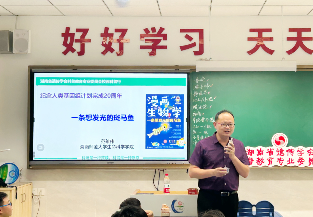 这次科普课堂由湖南省科普协会主任委员、生物学专家、《漫画生物学》科普书作者范雄伟教授主讲,范教授以其风趣幽默的授课风格,通俗易懂的语言讲解了关于生命起源、生物多样性和基因奥秘的知识。他通过科学图片展示、科普小动画和互动提问等多种形式,使课堂内容既有趣味性又具有知识性,让学生们能够更好地理解和参与其中。