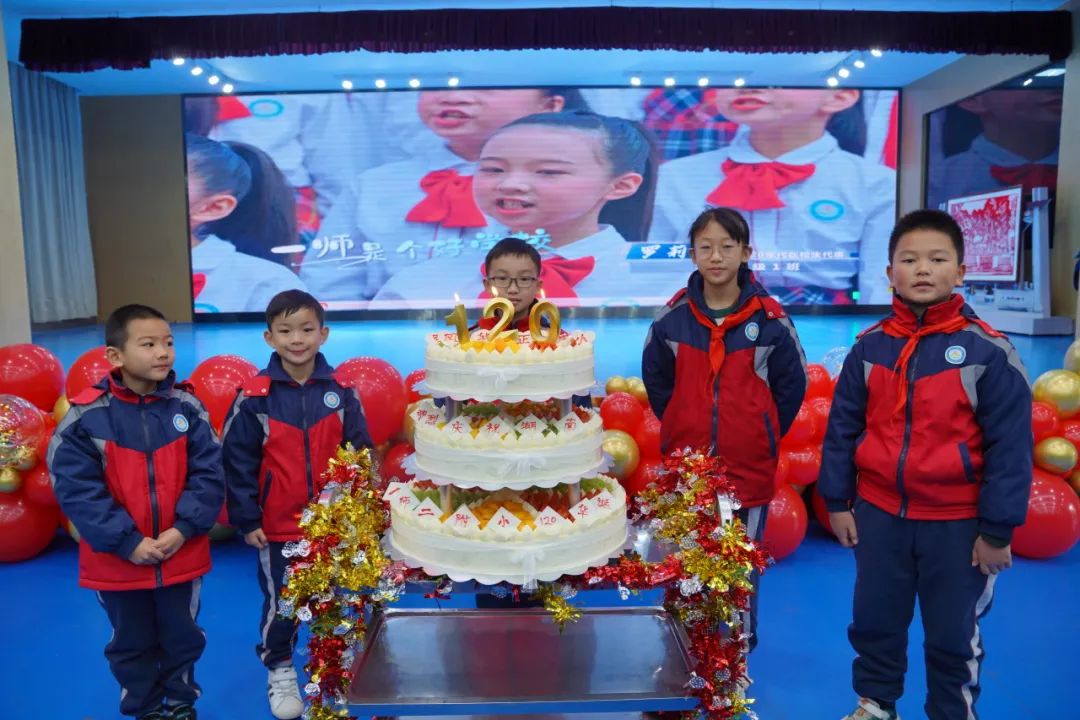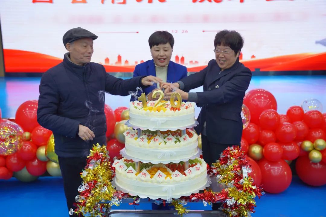 活动的最后,还有一份神秘的生日礼物!瞧,蛋糕车被缓缓推进舞台中央,全体师生起立,齐唱校歌,一同祝福一师二附小生日快乐!在大家热烈的掌声中,附小三届校长携手切开蛋糕,为学校的百廿光辉历程祝福,祝福学校的明天更美好,孩子们的明天更灿烂!