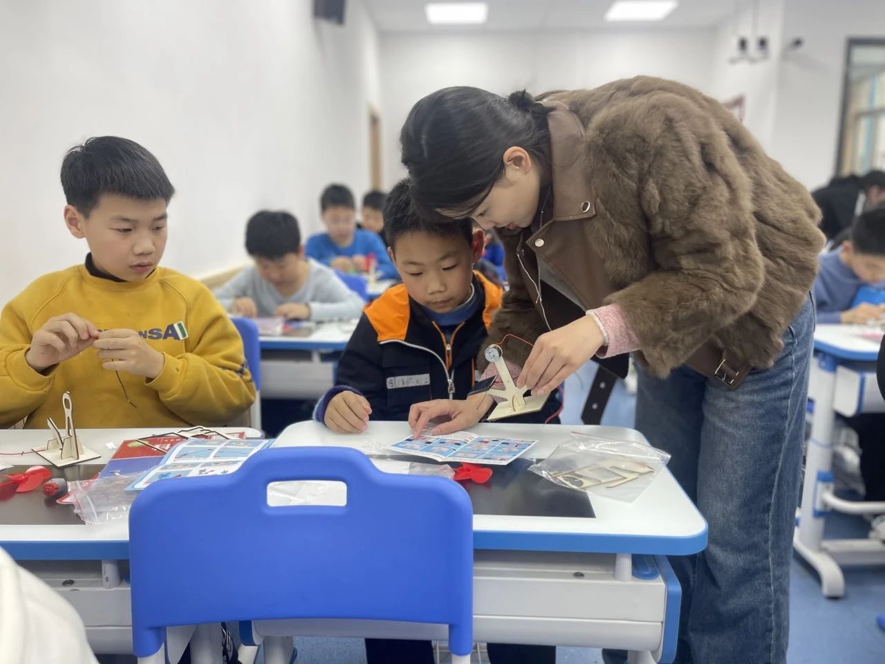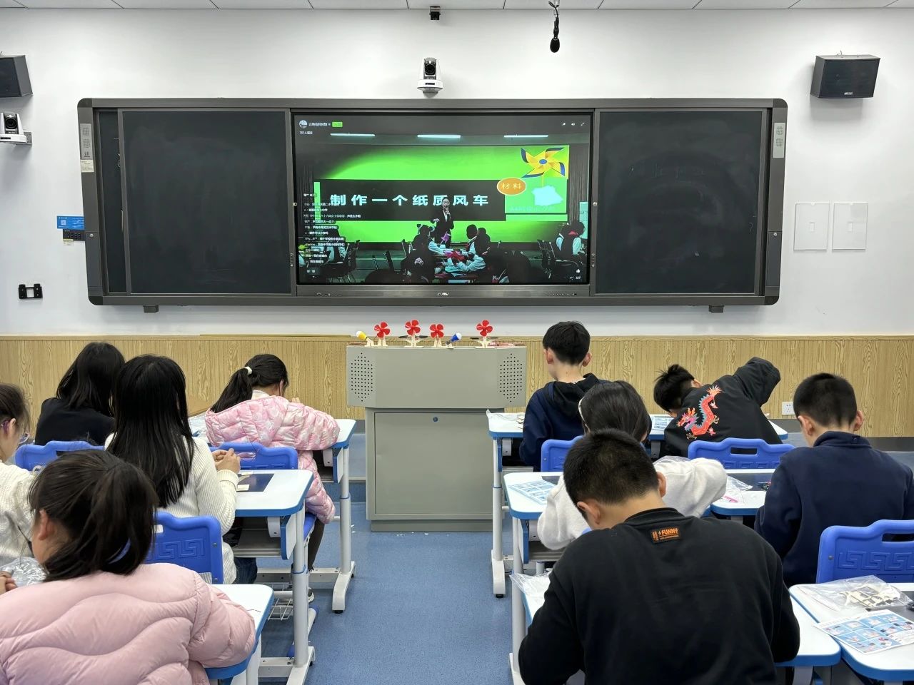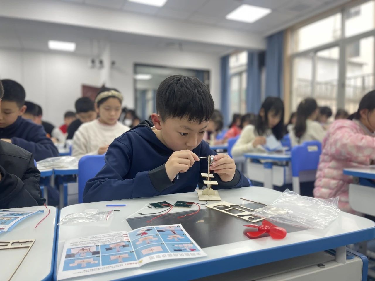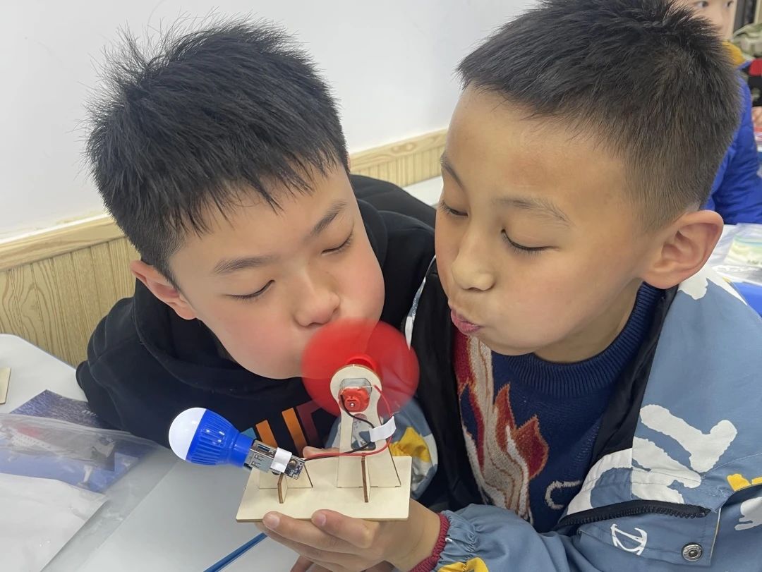 为了让同学们更直观地了解绿色发电技术,活动还设置了多个实践操作环节。瞧,同学们借助实验材料包,正在亲手制作新能源发电模型。他们在科学老师的指导下,将木板、电线、太阳能电池板、升压板等零散的材料有序拼装制成了太阳能风扇、风力电灯。在此过程中,同学们表现出极高的学习热情,不仅亲眼见证了风能和太阳能如何转换成电能,更沉浸在亲手制作绿色发电装置的成就感中,十分兴奋!
