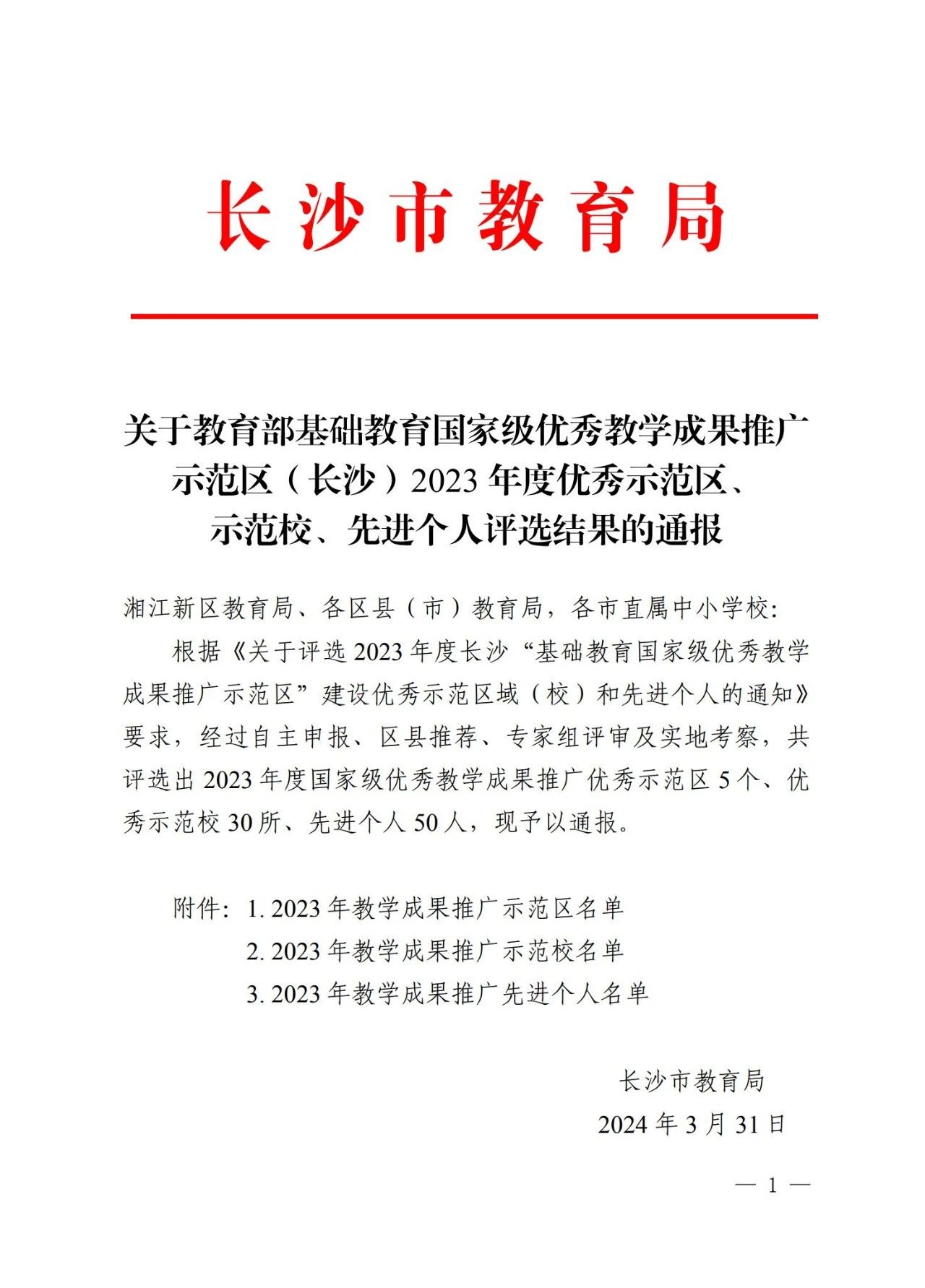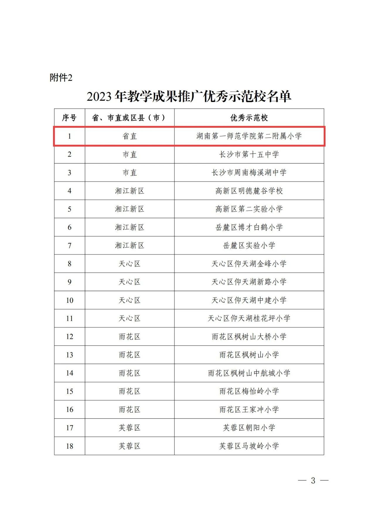 近日,长沙市教育局公布了《关于教育部基础教育国家级优秀教学成果推广示范区(长沙)2023 年度优秀示范区、示范校、先进个人评选结果的通报》。湖南一师二附小被评为“2023 年教学成果推广优秀示范校”。