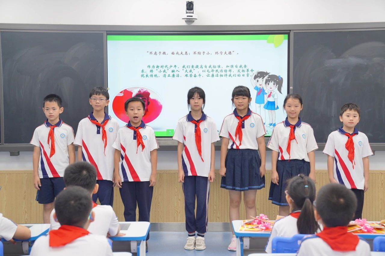 四(5)中队的同学们一齐呼唤“廉洁”。作为新时代少年,他们将“小我”融入“大我”,让廉洁相伴日常,弘扬风清气正的风貌。以毛泽民为榜样,发扬革命优良传统,清正廉洁,艰苦奋斗。