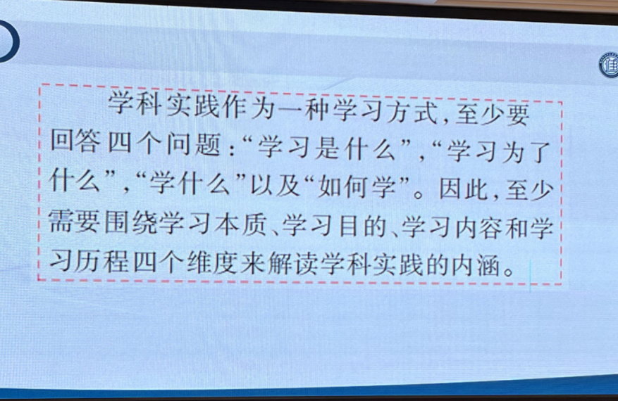 王老师首先指出,学科实践就是要解决学习“是什么”“为什么”“学什么””如何学”的问题,学习不仅是知识的传递,更是学生能力培养和素质提升的关键环节。只有将实践作为桥梁,教学才能实现质的飞跃。接下来,王老师从四个维度对学科实践进行了深度剖析,将学科实践与传统的知识授受和探究学习进行了差异分析,发现学科实践是知识授受与探究学习的超越,是新一代的学习方式。