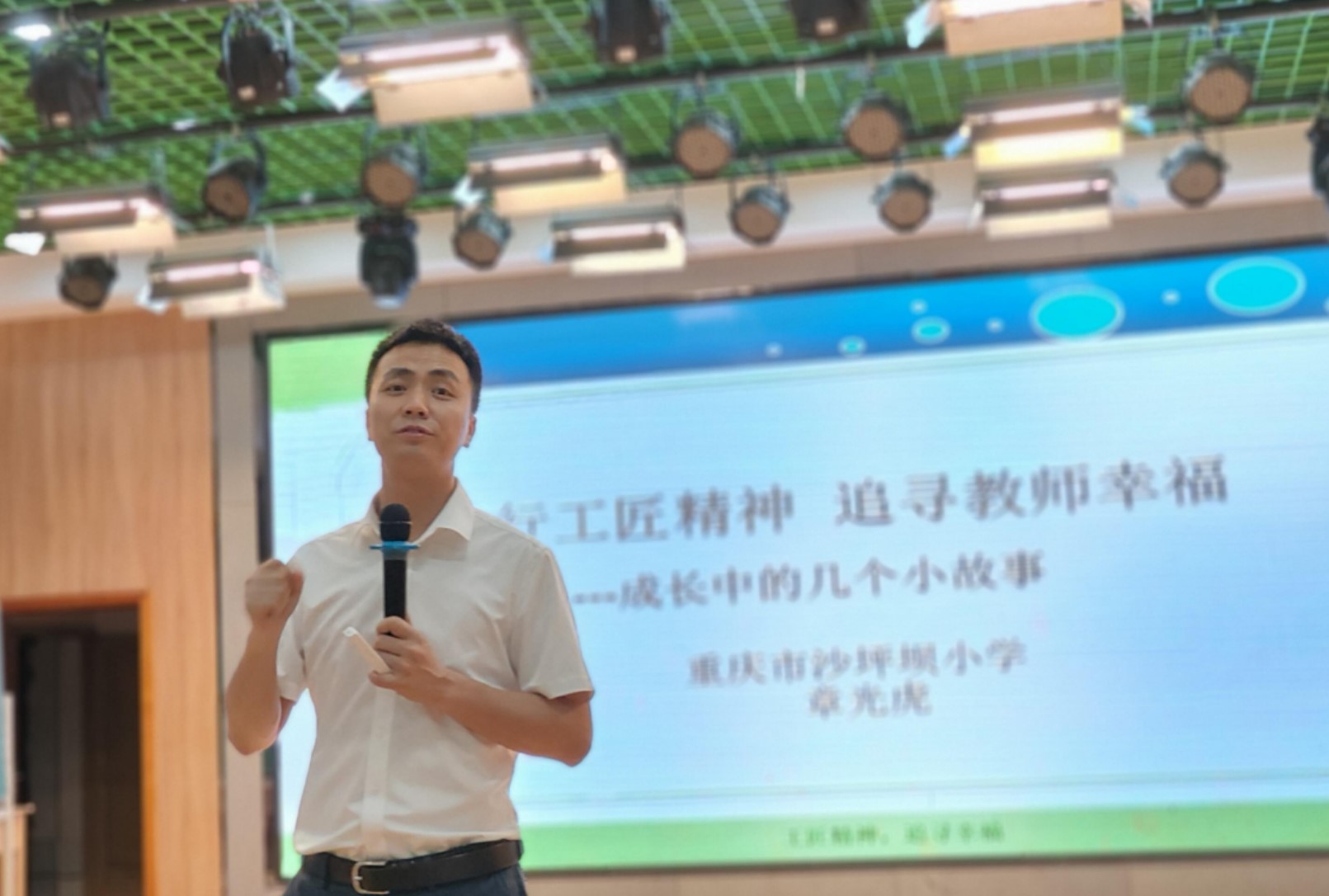下午,全体学员来到重庆市沙坪坝小学实践访学。沙坪坝小学章光虎校长以《践行工匠精神,追寻教师幸福》为题,和大家分享了自己成长中的几个小故事,阐述了什么是幸福,什么是工匠精神。