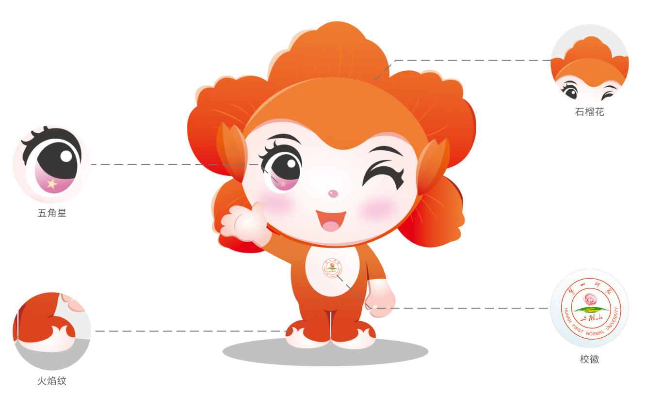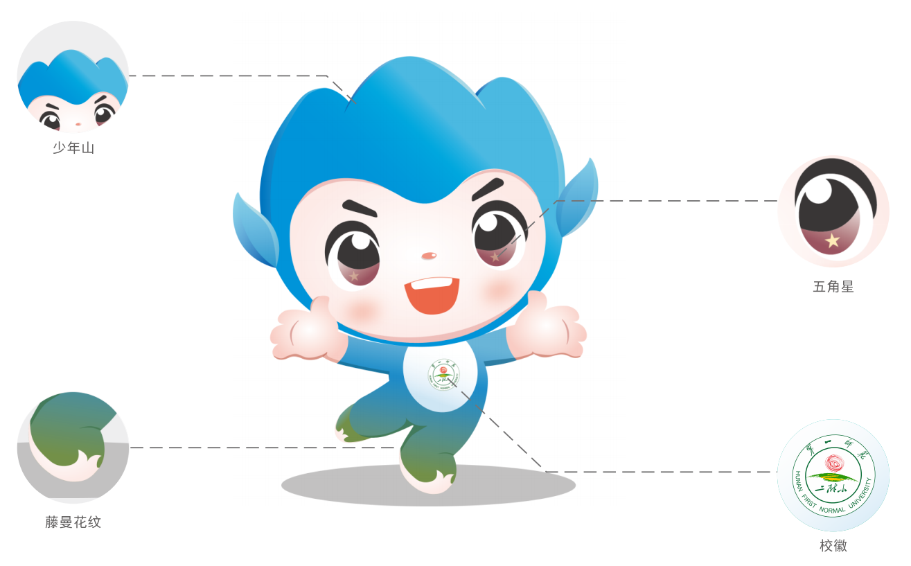 设计理念:山青青,是一个阳光童趣的山娃娃,他的形象设计是以少年山为创意灵感,他眼睛里的五角星,象征着学校的红色文化,脚上的藤蔓寓意着生长和希望。花朵朵,她的形象设计是以石榴花为创意灵感,同时融入了五角星和火焰等元素,她脚上的火焰代表着学校光辉的历史传统,绽放的花朵寓意着未来和希望。