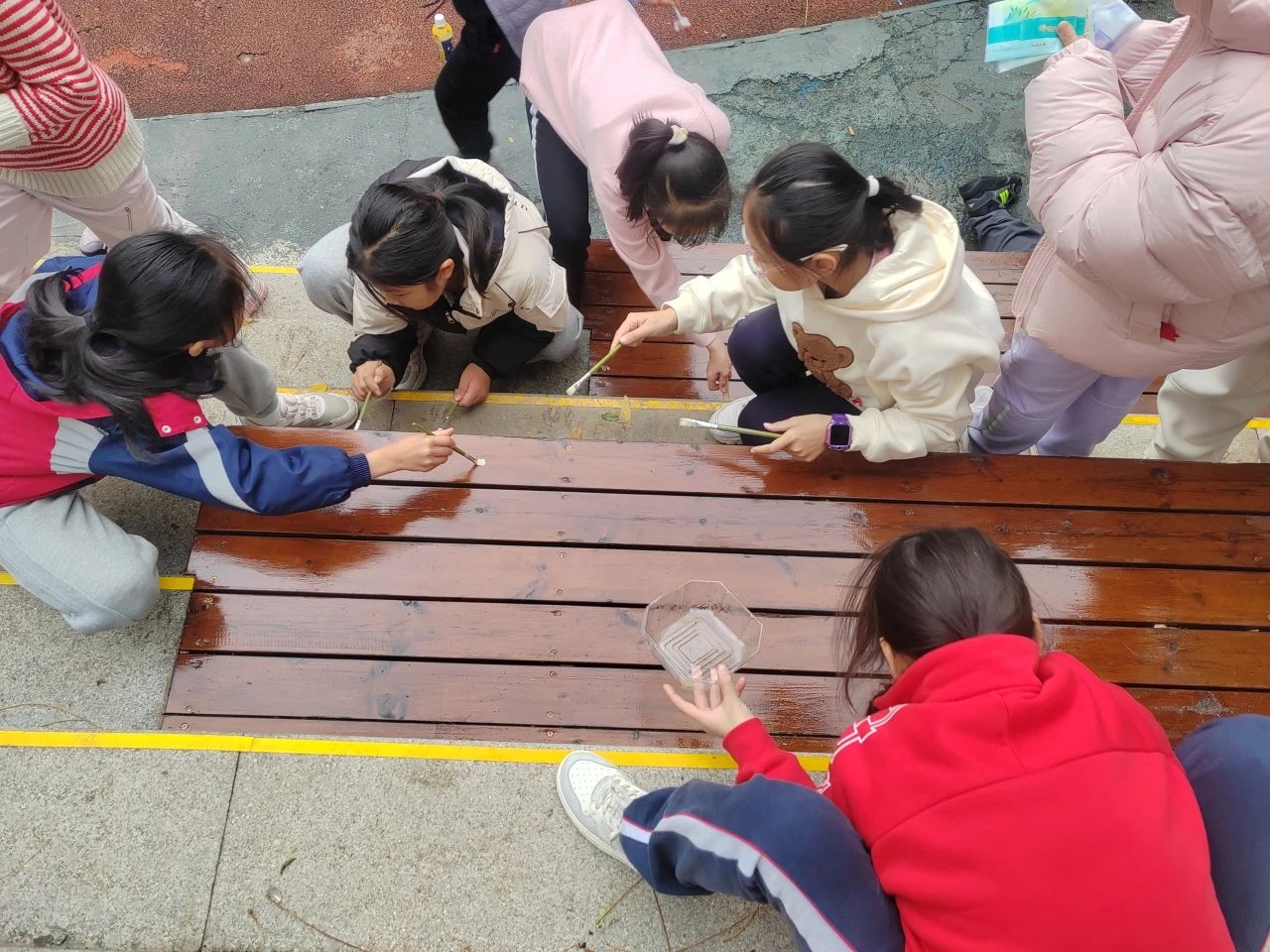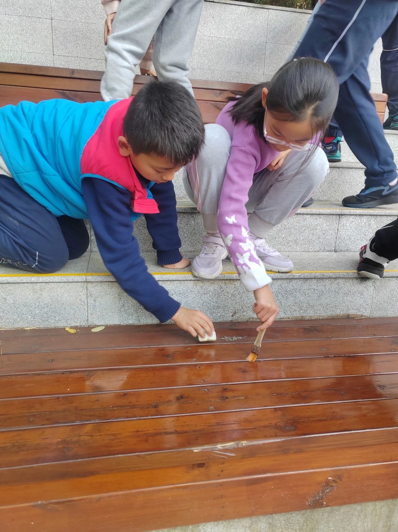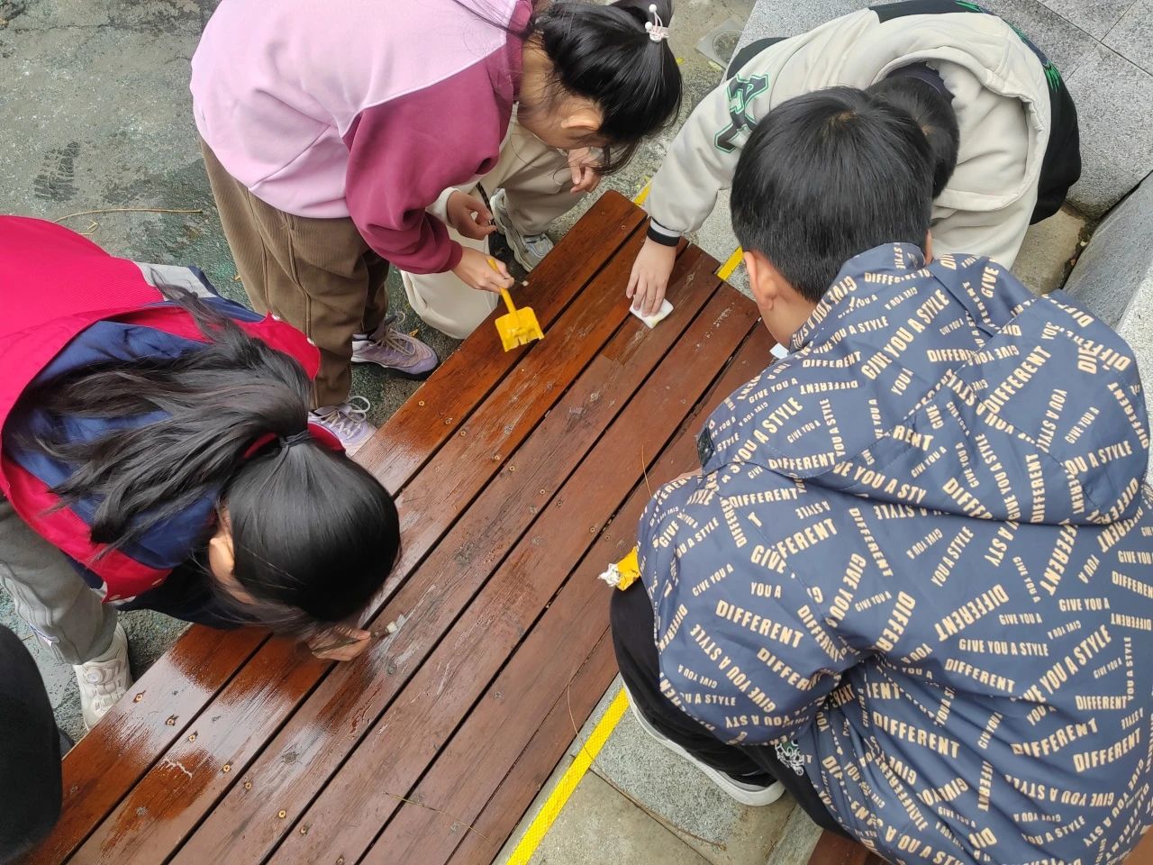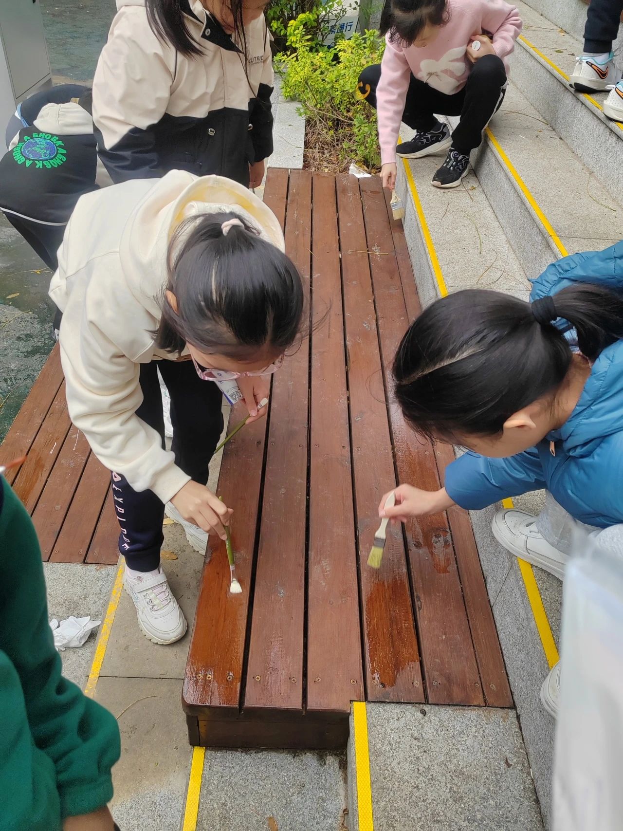 万事俱备,只欠东风。在接下来的综合实践活动课程时间里,同学们在学校的少年山上开展了为期三周的刷桐油工作。大家分组合作,从清理木凳表面、调配桐油、制作涂刷工具到正式涂刷,每一个环节都认真细致,确保涂刷工作的高效和质量。涂刷油漆的过程中,同学们掌握了实际的涂刷技巧,体会到了团队协作和分工合作的重要性。活动结束后,郭老师组织同学们召开涂刷成果展示和分享会:分享涂刷心得,总结经验教训;邀请其他老师和同学参观涂刷成果;倡议大家将所学的环保知识应用到校园生活中,共同维护校园的美好环境。
