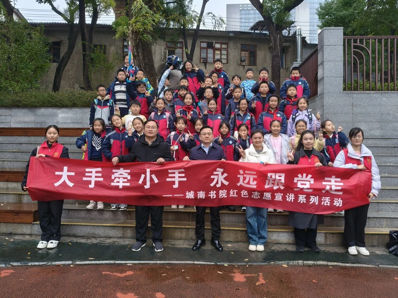 为进一步落实习近平总书记来校考察时提出的“红色资源要利用好,‘大思政’要抓好”的殷殷嘱托,11月25日下午,湖南第一师范学院城南书院党委书记鲁云生、综合办主任聂凯、学工办主任彭述生带领恰同学少年志愿服务队的同学来一师二附小开展“大手牵小手,永远跟党走”红色故事宣讲活动。