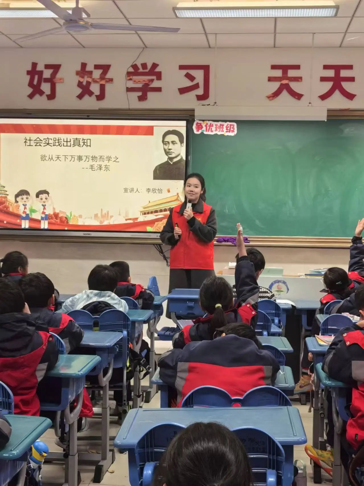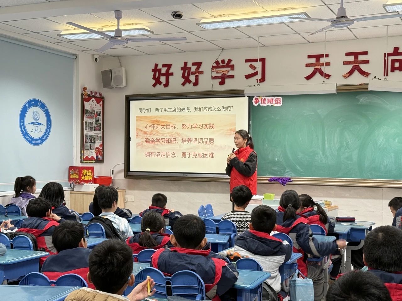 三位老师循循善诱,故事娓娓道来,孩子们深听细悟,受到了一次精神的洗礼。大家纷纷举手谈起了自己的感受:有的立志要向毛主席学习,多读书多看报,不仅要读有字之书,更要读无字之书,有的立志长大后要当老师,培养更多杰出人才,还有的说要好好学习,为实现中华民族伟大复兴贡献自己的力量……这一个个立志感人的故事,点燃了孩子们爱党、爱国的热情,激荡着孩子们奋发图强、勇担重任的决心。