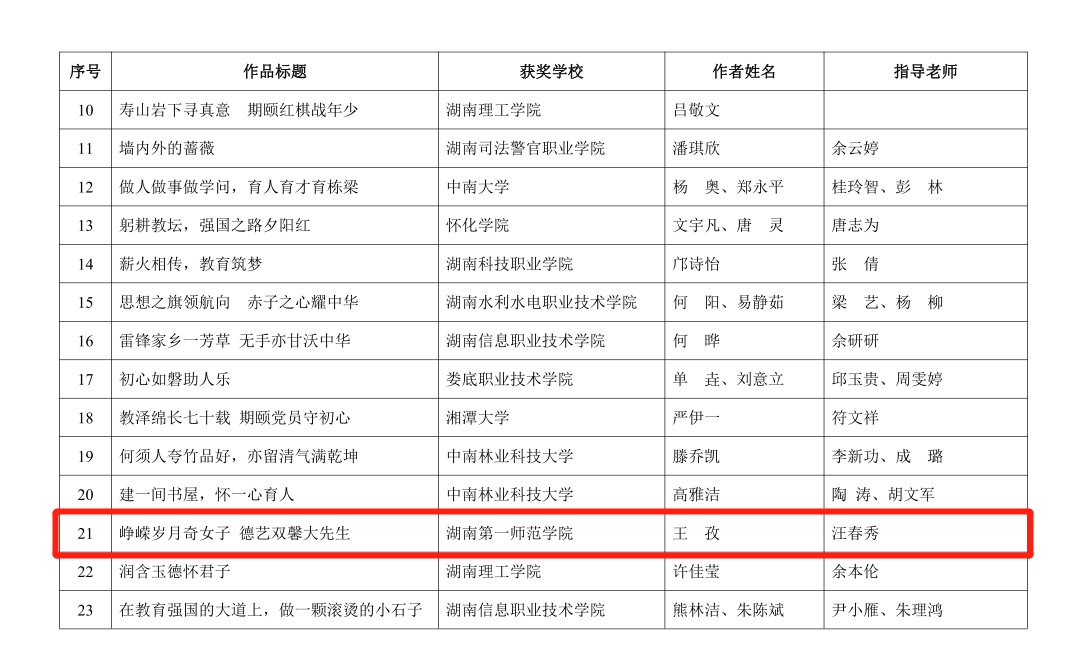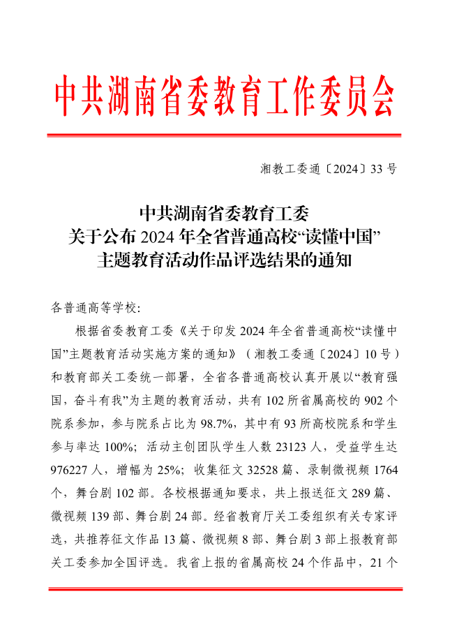 近日,中共湖南省委教育工委公布2024年全省普通高校“读懂中国”主题教育活动作品评选结果,由我校汪春秀校长指导,王孜老师撰写的征文《峥嵘岁月奇女子 德艺双馨大先生》荣获湖南省二等奖。