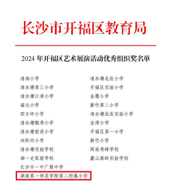 热烈祝贺湖南一师二附小“润之”舞蹈队、“润之”合唱团在2024年开福区中小学生艺术展演中双双荣获一等奖!附小荣获优秀组织奖。