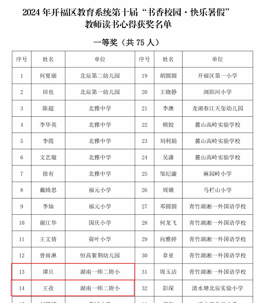 书香浸润心灵,成果彰显风采。在2024年暑假期间,我校教师积极参加长沙市教育系统第十届“书香校园,快乐暑假”教师读书征文活动,并荣获多项殊荣。具体获奖情况如下: