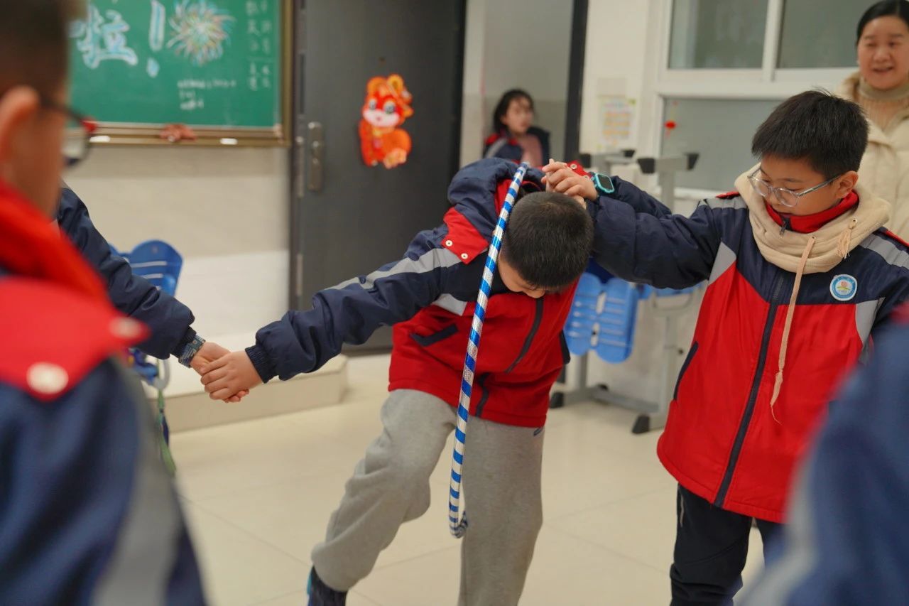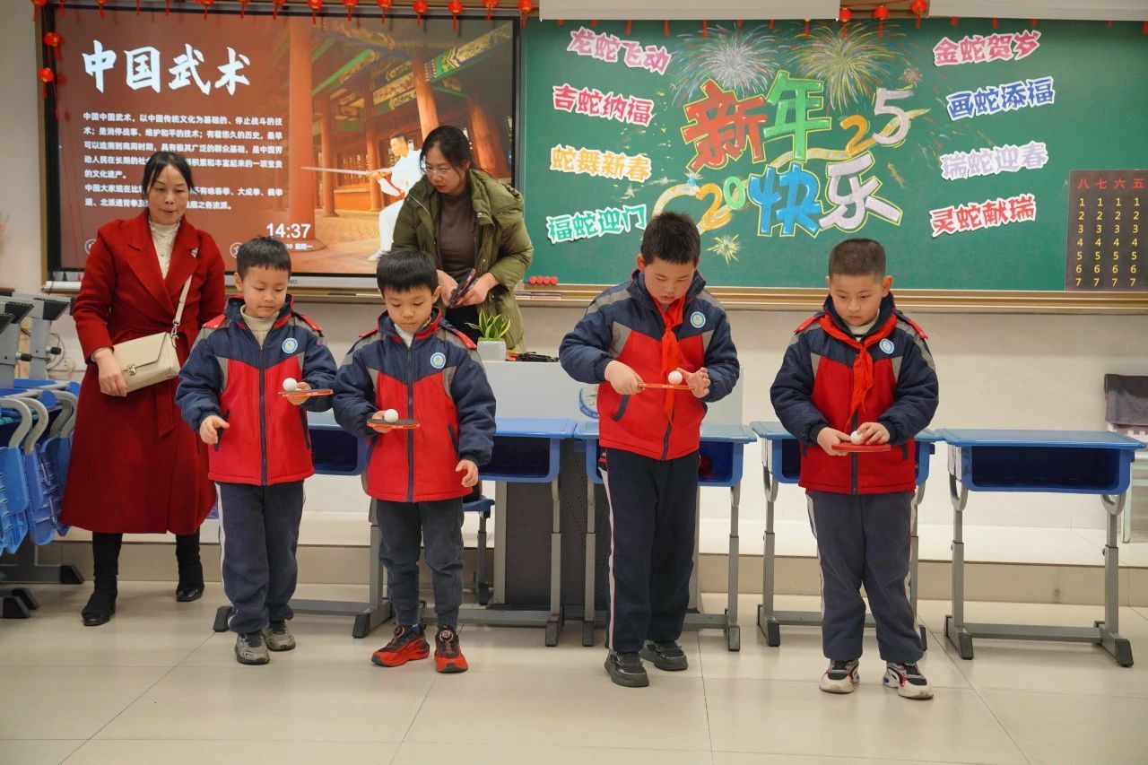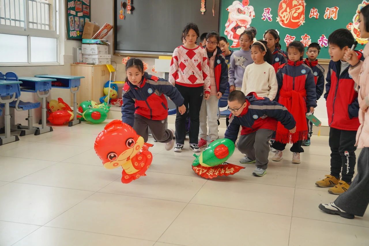 教室里则绽放着传统与现代碰撞的火花:非遗拓印技艺与生肖元素相融合,孩子们用拓印工具定格灵蛇的曼妙姿态;成语接龙与民俗猜谜将传统文化化作趣味挑战;“画蛇点睛”创作区里,稚嫩的画笔为神话故事注入童真想象。现代科技元素同样大放异彩,“贪吃蛇”游戏与实体竞技相映成趣,蒙面敲锣、巧夹元宵等传统游艺焕发新活力。