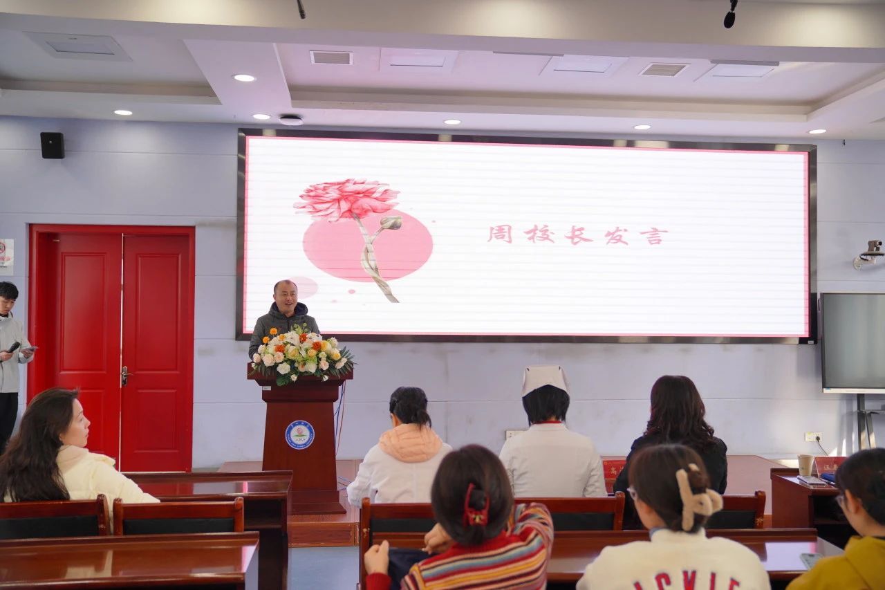 周校长上台致节日贺辞。周校长充分肯定了女教职工们在学校教育教学工作中的卓越贡献,感谢她们的辛勤付出和无私奉献,让学校的教育事业蓬勃发展。同时,周校长也强调了本次活动对教职工身心健康和团队建设的积极意义 ,激励大家在活动中放松身心、增进情谊。