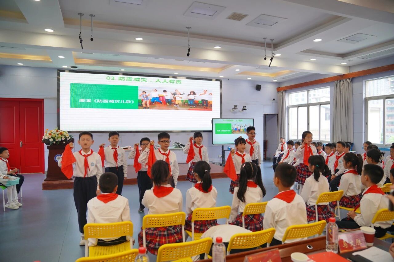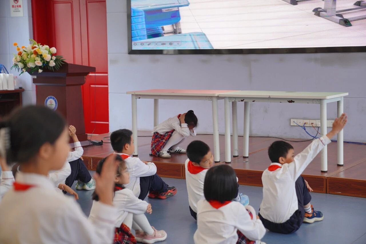 活动现场,三(2)中队开展了 “地震不慌,避险有方” 主题队会。队会通过视频观看、知识讨论、情景剧演示等形式,系统讲解了地震的成因与危害,并重点传授了 “伏地、遮挡、手抓牢” 等避险求生技能,演示了应急包物资整理方法,最后以《防震减灾儿歌》表演加深安全知识印象。队员们在沉浸式体验中学习防震知识、增强安全意识、提升应急反应能力。