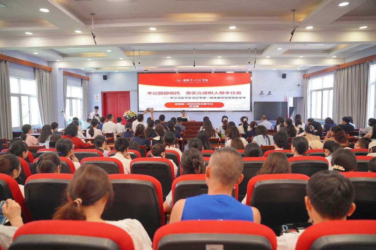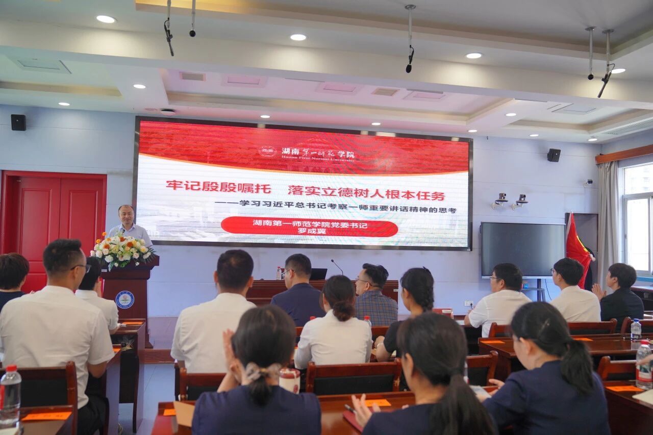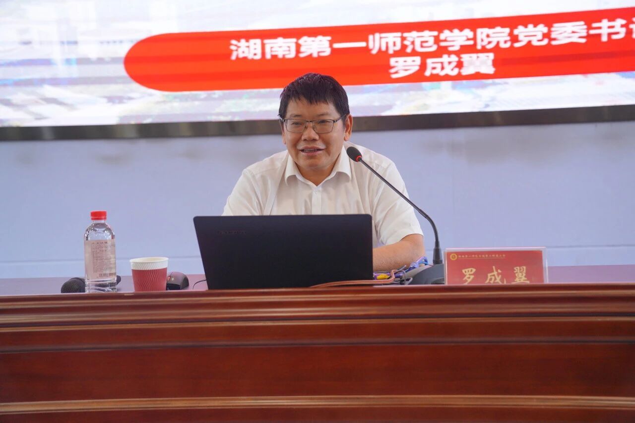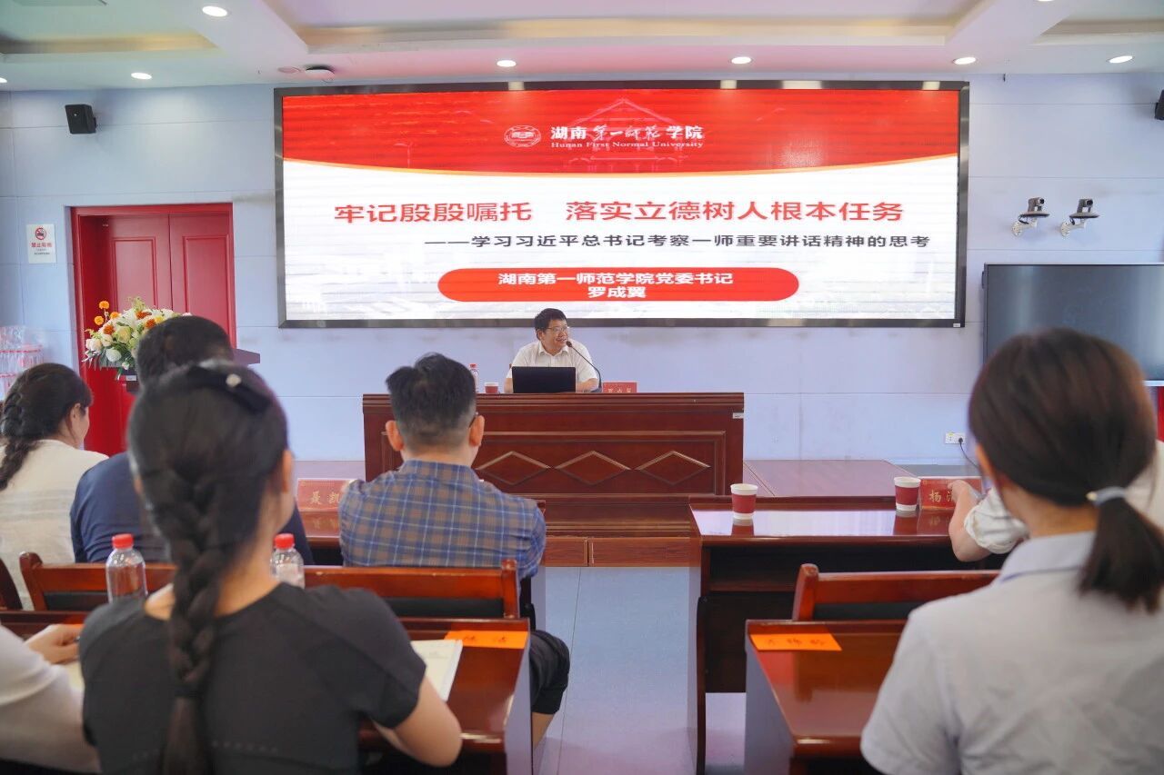罗成翼书记深情重温了习近平总书记考察湖南第一师范学院时的殷切嘱托,聚焦“立德树人”这一根本任务,深刻阐释了重要讲话的核心要义:必须坚守“用好红色资源,传承红色基因”的时代使命,以深化“大思政课”改革为关键抓手,着力培养堪当民族复兴大任的栋梁之材。他强调,落实这一根本任务,核心在于坚持党的全面领导、深化思政改革、赓续红色血脉、淬炼高尚师德,奋力书写新时代一师“立德树人”的优异答卷。