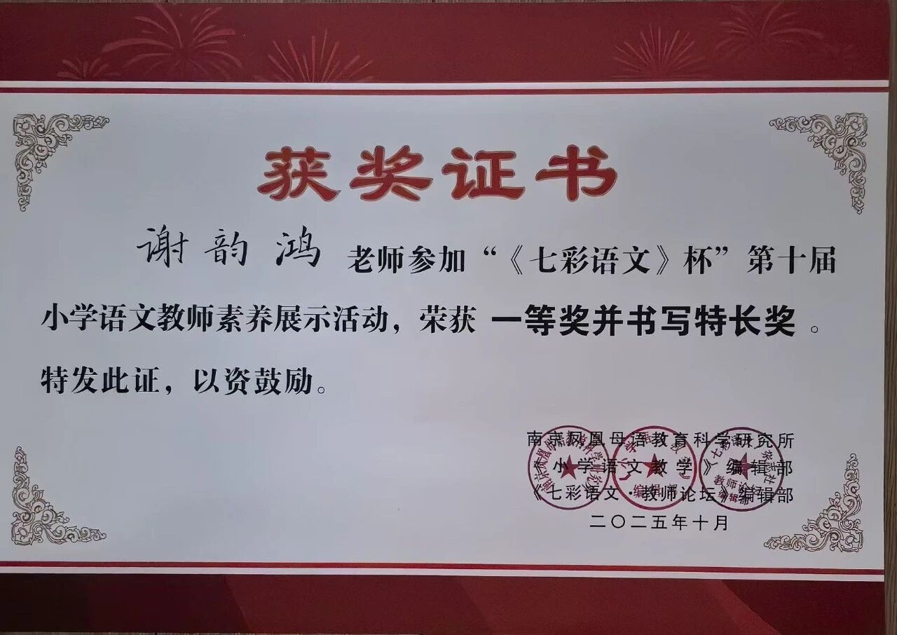 捷报传来,附小荣光!在刚刚落幕的全国小学语文教师素养展示活动中,我校优秀青年语文教师谢韵鸿凭借过硬的综合素养和出色的现场发挥,一举斩获“一等奖”并“书写特长奖”! 这一骄人成绩,是我校教师专业发展道路上的重要里程碑!