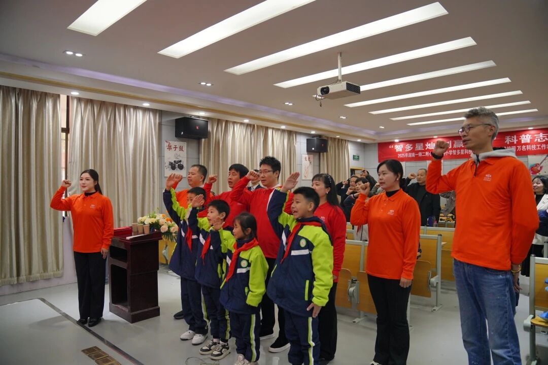随后,长沙爱乐博科技董事长、科普志愿团团长代表王利平发言,表达了志愿团队投身青少年科普教育的初心与热忱;湖南赛恩教育科技发展中心主任、志愿团团长胡琛带领全体志愿者庄严宣誓,铿锵誓言彰显了“奉献、友爱、互助、进步”的志愿精神。