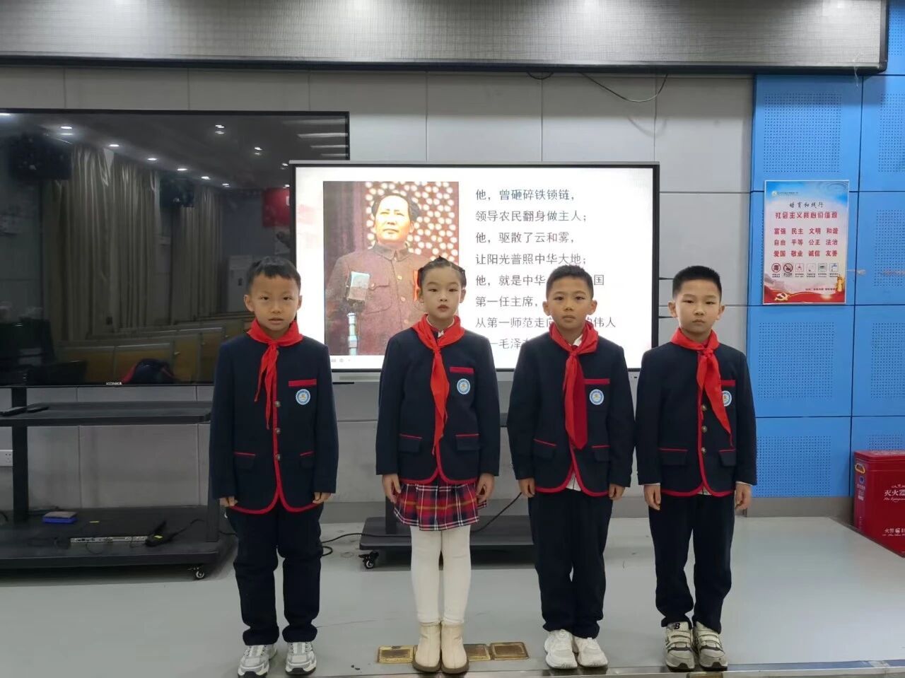 仪式上,四名少先队员代表以深情的话语拉开活动序幕。他们回顾了毛泽东同志作为新中国缔造者、人民领袖的卓越贡献。在庄严的仪式中,全体师生表达了对伟人的崇高敬意。