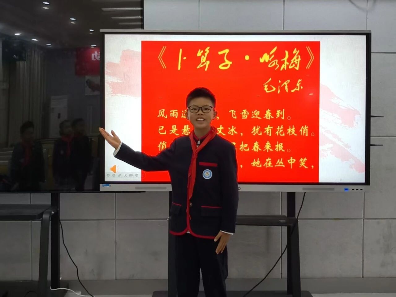 伴随着《太阳最红,毛主席最亲》的温暖旋律,三(1)中队队员以手势舞形式,表达了新一代少年对伟人的敬爱与怀念。在许嘉翊同学的带领下,全体师生齐声朗诵毛泽东诗词《卜算子·咏梅》,在“待到山花烂漫时,她在丛中笑”的经典诗句中,体悟不畏艰难、无私奉献的梅花品格。