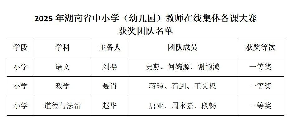 捷报频传,载誉而归。近日,2025年湖南省中小学(幼儿园)教师在线集体备课大赛圆满落幕。我校三支教师团队经过层层选拔,并在决赛中完成现场答辩,最终凭借出色的整体表现,均荣获大赛一等奖!