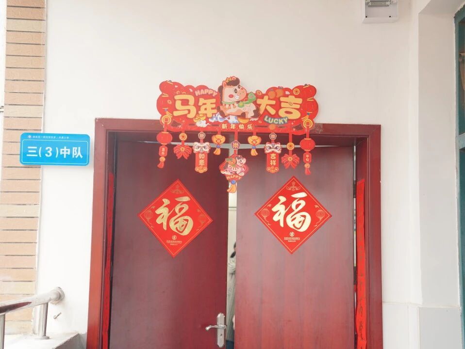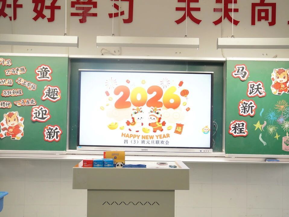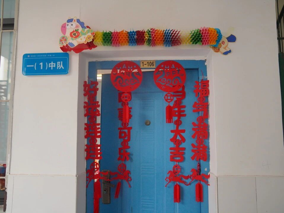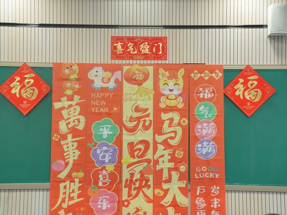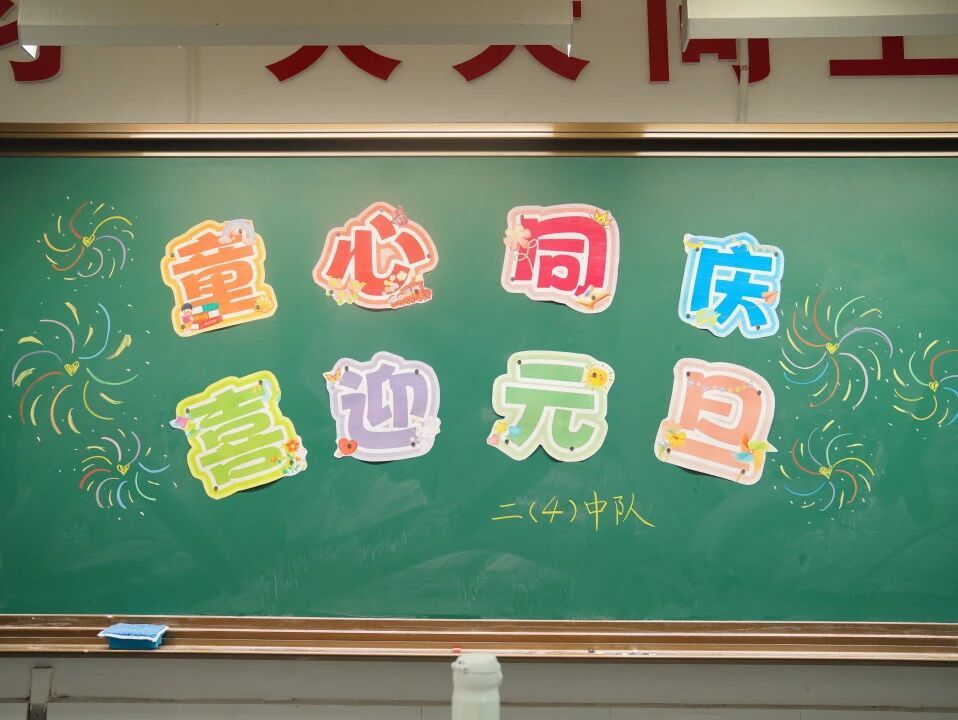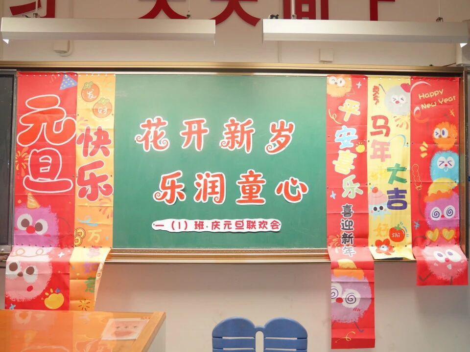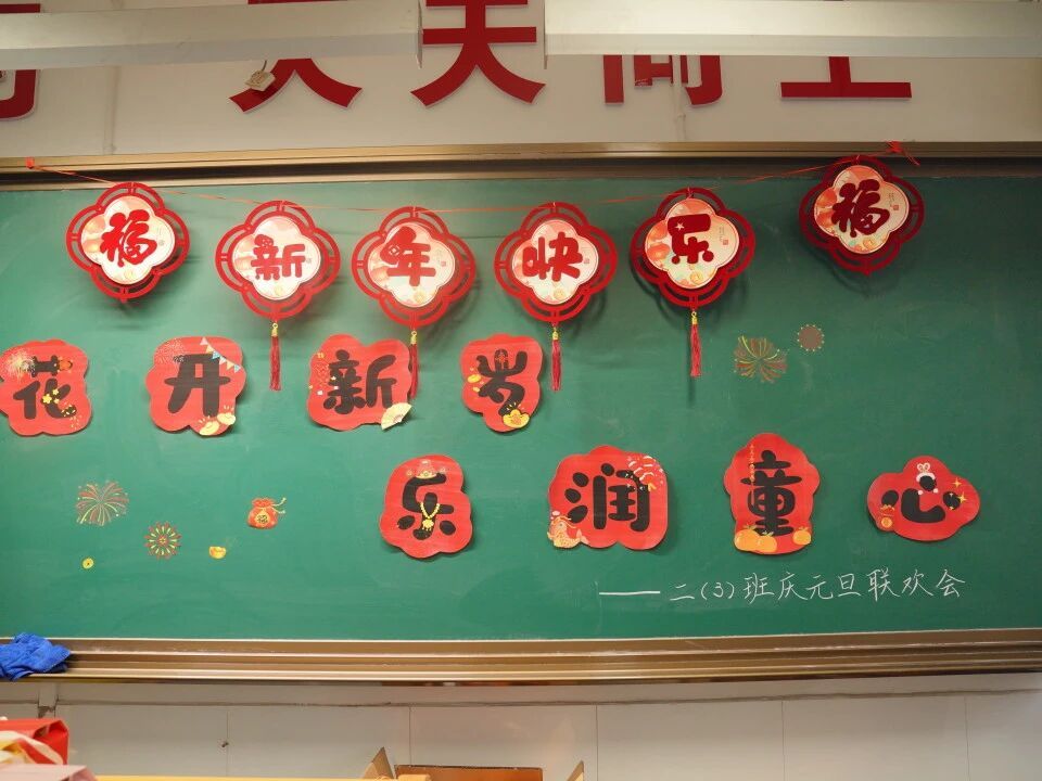 元旦的脚步悄然而至,各班级在师生的共同布置下,洋溢出浓浓的节日气息。教室前的黑板上,绘满了五彩缤纷的元旦主题画——绽放的礼花、可爱的生肖、洋溢的笑脸,一笔一画皆寄托着对新年的憧憬。门框上,一副副鲜红的春联整齐贴挂,一串串灯笼与缤纷彩带交错垂悬,将整个教室装点得温暖而喜庆。这片由孩子们亲手参与布置的天地,满载着纯真的欢喜,也为接下来的联欢活动铺就了绚丽温馨的底色。