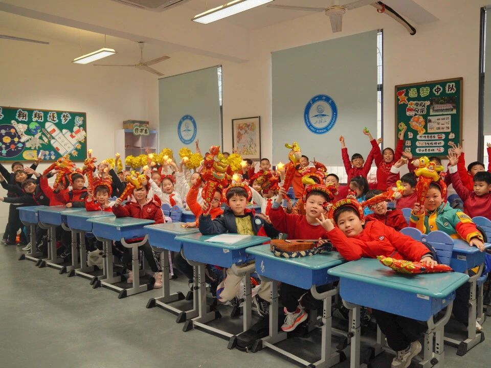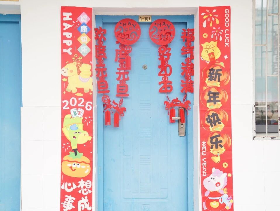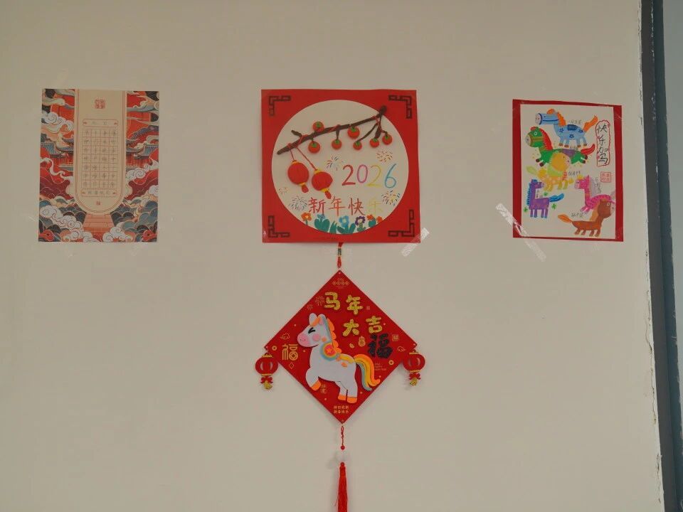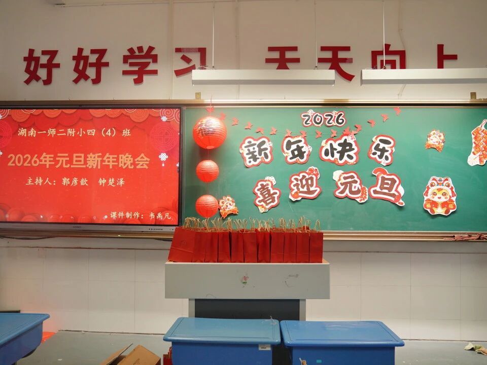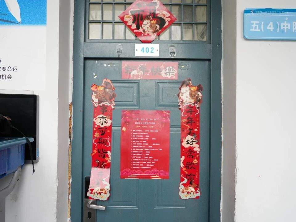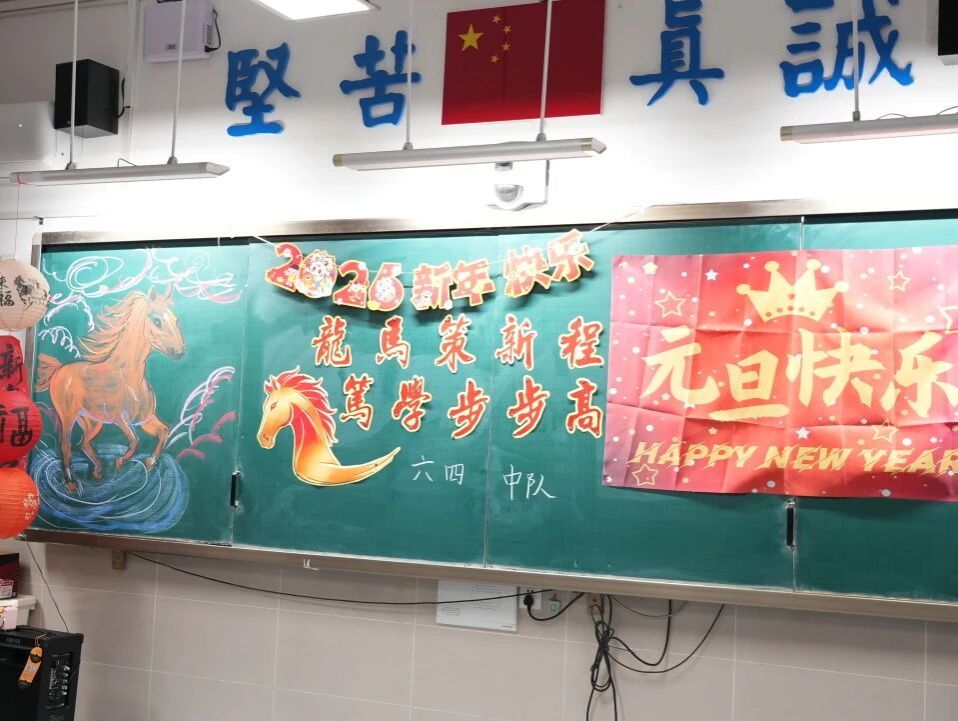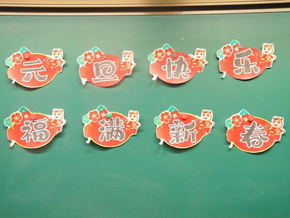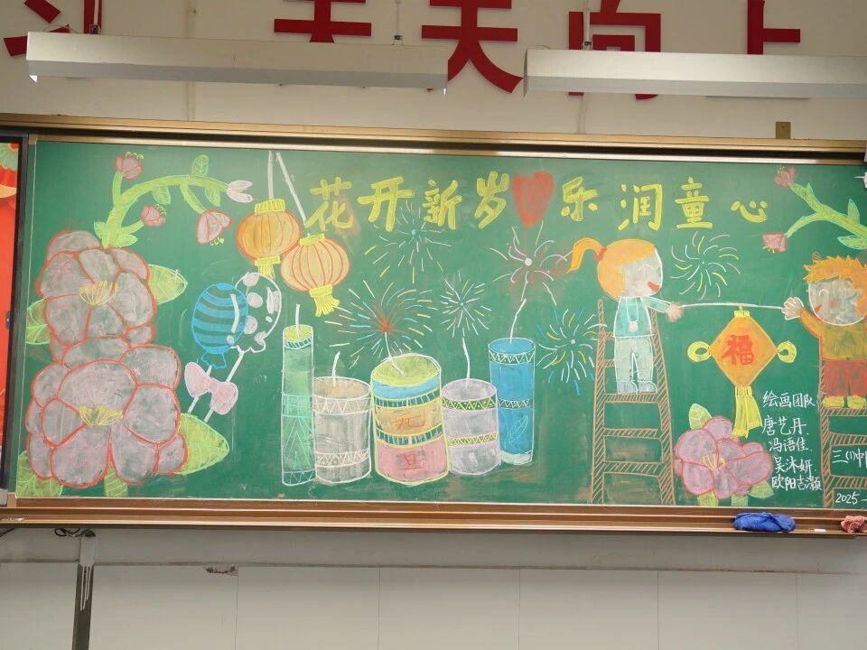 元旦的脚步悄然而至,各班级在师生的共同布置下,洋溢出浓浓的节日气息。教室前的黑板上,绘满了五彩缤纷的元旦主题画——绽放的礼花、可爱的生肖、洋溢的笑脸,一笔一画皆寄托着对新年的憧憬。门框上,一副副鲜红的春联整齐贴挂,一串串灯笼与缤纷彩带交错垂悬,将整个教室装点得温暖而喜庆。这片由孩子们亲手参与布置的天地,满载着纯真的欢喜,也为接下来的联欢活动铺就了绚丽温馨的底色。