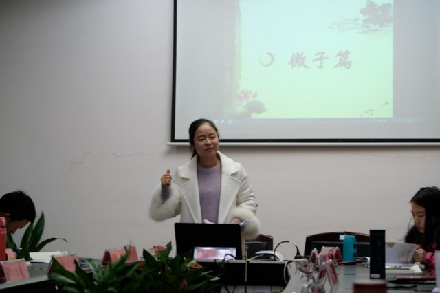 接着,与大家进行分享的是数学老师——张平。睿智的张老师旁征博引,解读“宪问篇”的“不怨天不尤人”时,他不仅结合了孟子的“顺受其正”,还结合了宋代名儒周敦颐的词《西江月》,让人读到的不仅有先人的睿智,更多的是豁达、洒脱;解读“卫灵公篇”时,他时而结合自己的教学实际来谈孔子的“有教无类”,时而结合历史典故来阐述“小不忍则乱大谋”的道理;读到“季氏篇”的“益者三友”时,他还结合了国家主席习近平对外交流时的讲话。看来,要读懂《论语》这一本书我们还需读很多的“书”。