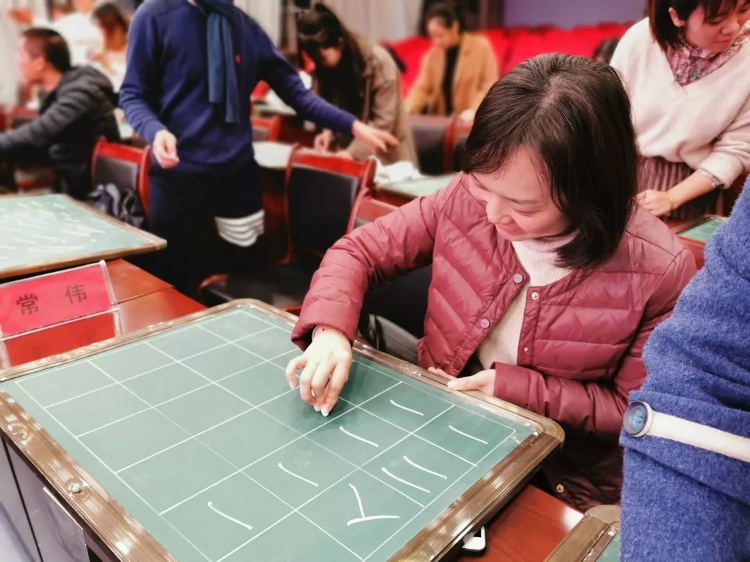 接着,易老师从汉字的基本笔画入手开始授课,老师们边写边悟,领会到易老师指导的练习”两笔字”要点:一心一意,循序渐进,正视问题,积极解决,不离不弃,……很多学员经过易老师的现场点评,从字形结构到书写节奏都有了立竿见影的成效!