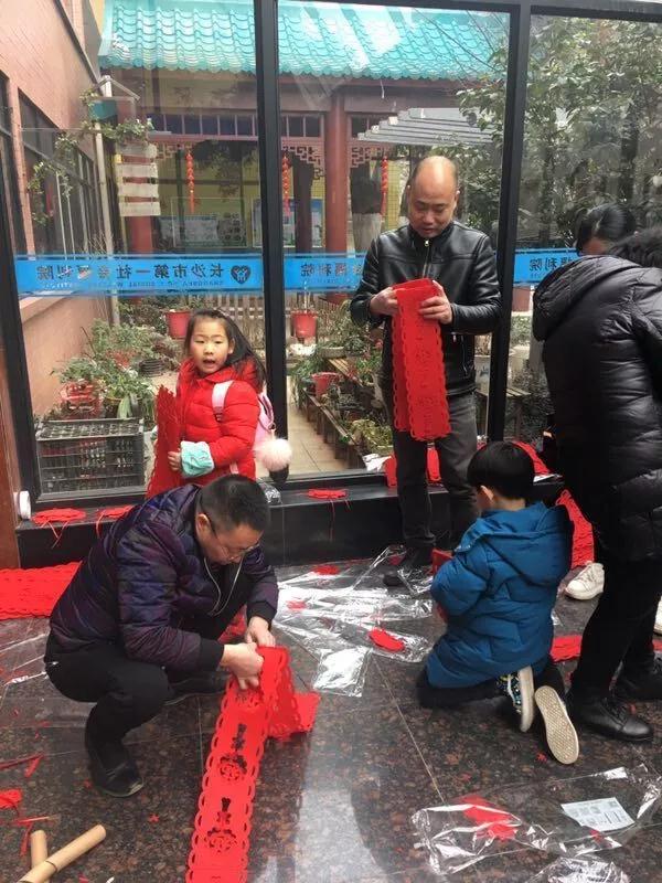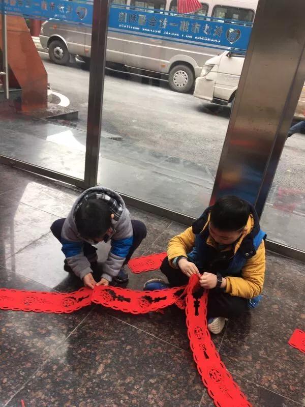 同学们来到福利院,首先认真聆听了福利院周阿姨做的活动介绍和安排。然后,根据布置任务的难易程度进行分工,女孩负责贴窗花和墙贴,男孩负责拼接福字拉花,爸爸们负责挂福字拉花,妈妈们有的贴窗花,有的贴对联、福字,大家干得热火朝天。