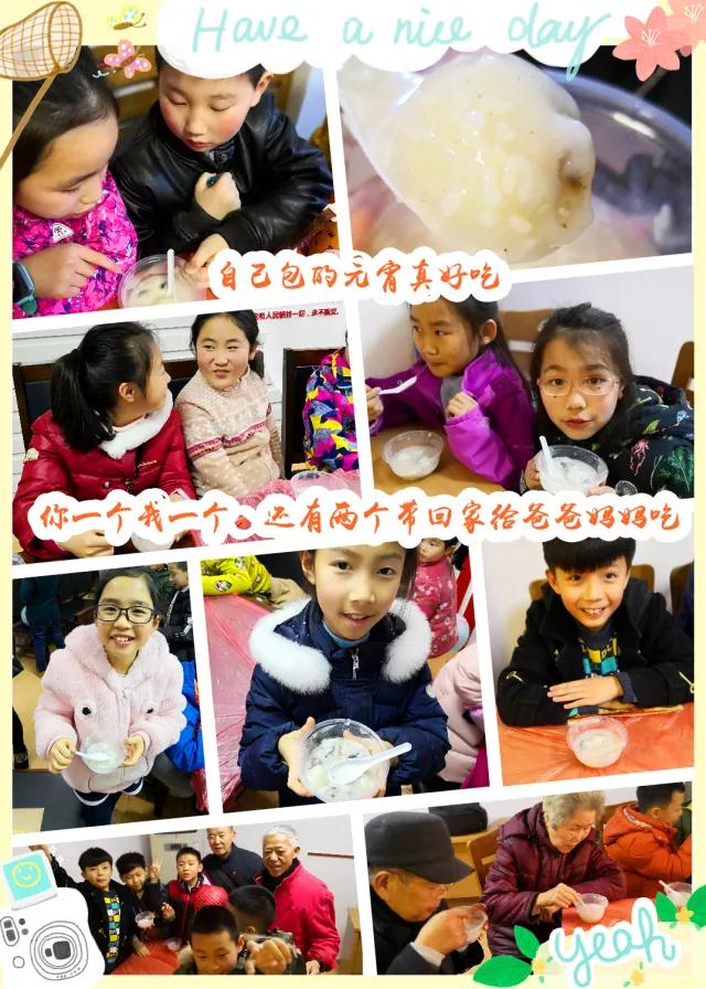 合照中有几个端着碗的小朋友都是舍不得吃自己做的汤圆,说要打包带回去带给爸爸妈妈尝尝,而自己仅仅是喝了几口煮汤圆的水。