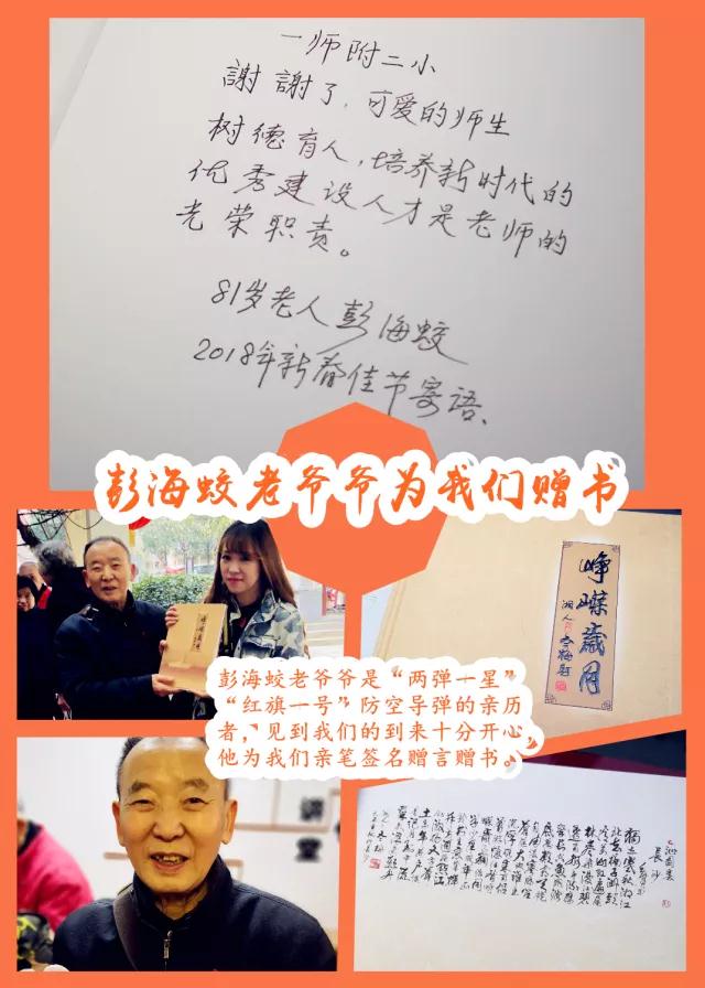 这位社区里鼎鼎有名的彭海蛟老人是“两弹一星”“红旗一号”防空导弹的亲历者,见到我们四3中队同学们的到来非常开心,还兴致勃勃地亲笔签名赠言赠书给我们。