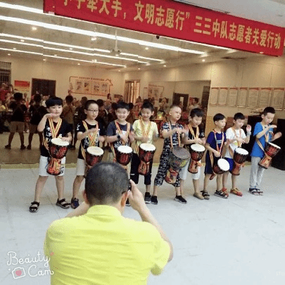 在报告厅,小男子汉们为老人们集体表演了十分精彩的非洲手鼓——《我的小宝贝》,老人们津津有味地欣赏着孩子们的表演,不时随着音乐拍手,在桌上拍打节奏,笑容瞬间绽放在他们的脸庞。