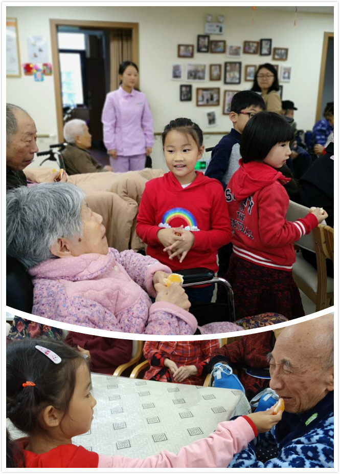 在班级小主持人的组织下,孩子们还亲手为爷爷奶奶剥开了一个个蜜桔。这里的爷爷奶奶大多失去了自由活动的能力,所以,孩子们都热情地将一瓣瓣蜜桔送到老人手中或嘴边。不少懂事的孩子还捞起衣袖为老人捶腿捏肩,有的还不忘在老人耳边分享一个有趣的故事。一双双稚嫩的小手,一句句童真的话语,一个个有趣的故事,都让爷爷奶奶们都感受到了祖孙之乐。