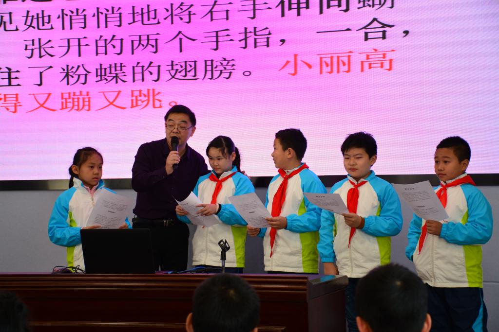 此次活动,最让大家高兴的是,有机会聆听安徽省亳州市谯城区进修学校副校长吴守涛老师的习作指导课和学术讲座。吴老师是首届“全国百佳语文教师”,特级教师,虽然担任亳州市谯城区进修学校副校长,但一直坚守在小学语文课堂的第一线,致力于小学习作教学的研究。上午9点,在大家的满怀期待中,吴老师走上讲台,开始了他的精彩课堂——习作指导课《动作描写》。上课前的短暂交流,吴老师让学生仔细观察,说说对他的第一印象。面对学生的童言无忌,他更是诙谐睿智地应对,让学生即刻与他亲近了起来。课堂上,吴老师首先用2个范例“拔河比赛”“小丽捉粉蝶”引路,引导学生自己发现、总结动作描写具体的方法。然后通过2个小魔术“徒手变钱”“白纸变钱”,让学生现场练笔试写,学会将动作描写具体。整个教学过程中,台上台下欢声笑语不断,吴老师神态、动作夸张,评价中肯激趣,牢牢抓住了学生的心。在与学生的对话中,他巧妙点拨、渗透方法:仔细观察,抓住细节,把动作分开来写,展开丰富的想象,写出自己的感受……整个课堂,循序渐进,扶放结合,所有的设计看似顺手捏来,实则匠心独运。一节课下来,大多数学生的习作已经大致成篇了。玩中学,学中玩,学生们不仅掌握了习作的技巧,还学得开心。让所有听课老师印象深刻的是:尽管下课铃响了许久,学生还围在讲台前不愿离去,有的向吴老师讨教魔术,有的将习作举到他面前非要他看看……