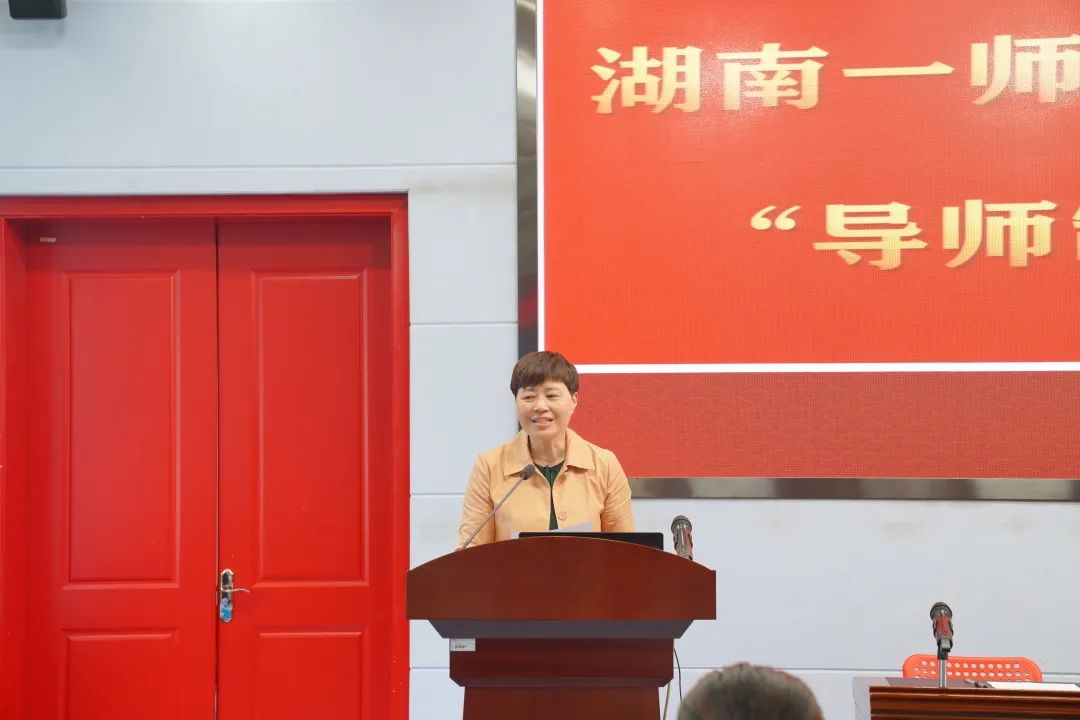 湖南一师二附小的易红英老师代表导师发表讲话。她分享了“心中有信仰,眼里有学生”的教育理念,她认为,当老师传达出对学生的善意、信任和关爱时,它唤醒的是学生的向学之心和向善之光。修身而道厚,道厚则业精,易红英老师倡导受导教师们在导师的引领下,争取成为一名不负时代、不负韶华,有责任、有担当的新时代优秀教师。