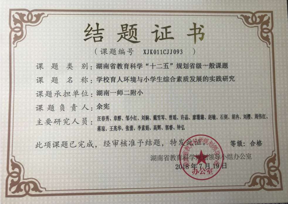 “学校育人环境与小学生综合素质发展的实践研究”结题证书
