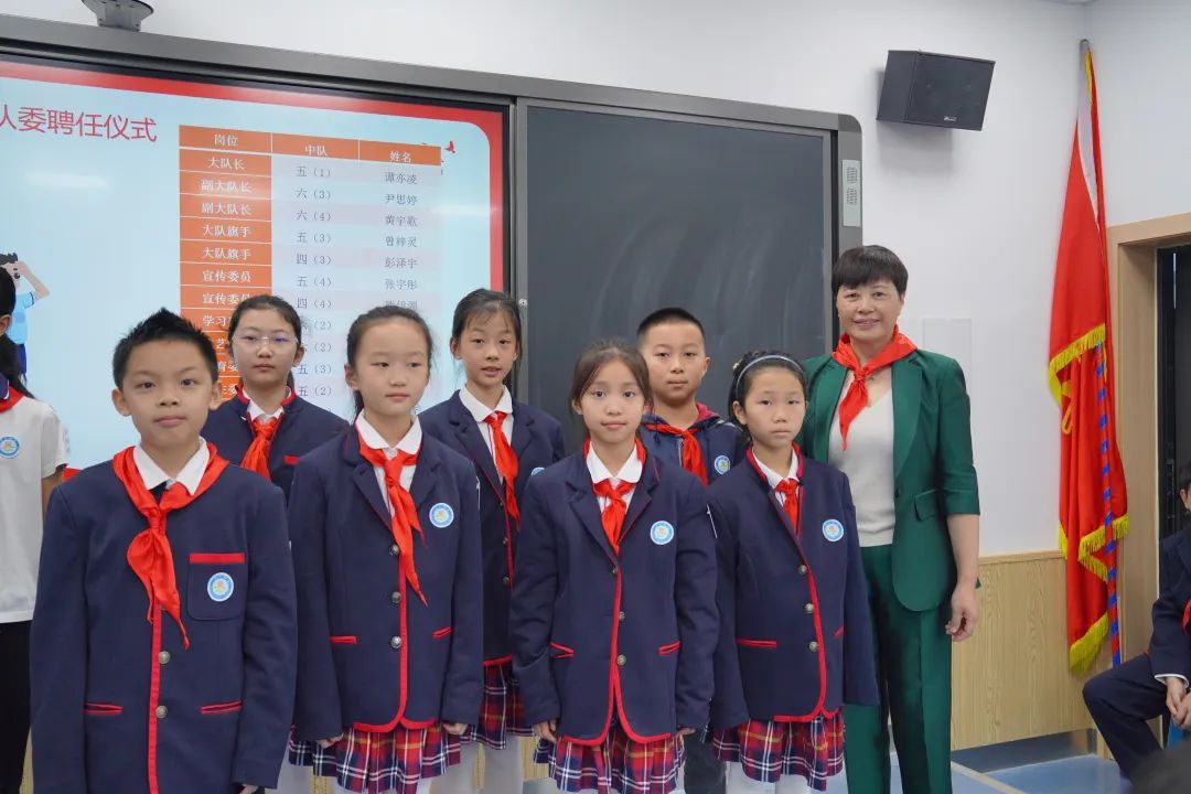 经过层层选拔,民主投票,最终选举出了13名少先队员担任我校新一届大队委员。在庄重的聘任仪式上,汪校长为新一届大队干部授予了大队标志。大队长谭亦凌同学代表全体大队委发言:感谢辅导员老师的精心培育和悉心指导,感谢全校少先队员的信任,大队委员们一定会尊敬师长,团结同学,刻苦学习,严于律己,努力成长为德、智、体、美、劳全面发展的新时代好少年!