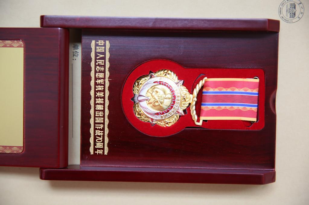 活动伊始,章醇校长将中共中央、国务院、中央军委颁发的“中国人民志愿军抗美援朝出国作战70周年”纪念章郑重地为志愿军战士沈军老师佩戴上。